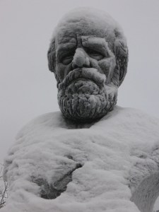 Kevätlukukauden alkajaisiksi lukiolle palaavia opiskelijoita ja opettajia tervehti seinän lämpömittarissa -28 asteen pakkaslukema. Lumenkolaajia väistelevä Eino Räsäsen (1902-1970) Leikkivä poika on pukeutunut vähän turhan kevyesti pakkassäähän. Raahen lukion pihan patsas paljastettiin v. 1961. Raahen veistostaiteesta on hyvä artikkeli matkailuoppaiden sivulla. Kannattaa myös tutustua Kari Juvan veistospuistoa käsittelevään sivustoon, sillä veistospuisto sijaitsee vain kivenheiton päässä lukiosta.