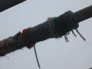 Visuaalisen kulttuurin muotoja syntyy ja kuolee nopeaan tahtiin. Bongasin elämäni ensimmäiset neulegraffitit Helsingissä. Töhryjen, käsityön ja katutaiteen rajamailla liikkuvasta ilmiöstä olin kuullut jo aiemmin, mutta omin silmin en neulegraffitia ollut nähnyt. Olin kuvisopettajien koulutuksessa ´Verkoissa ja verkostoissa´, jossa käsiteltiin tietoverkkojen ja sosiaalisen median käyttöä kuvataideopetuksessa. Luentopaikalle siirtyessä törmäsin näihin kaiteeseen kiinnitettyihin lankaputkiloihin. Katutaiteeksi sijoitettuja neulegraffiteja esitellään useissa blogeissa – uusi visuaalisen (nais?)kulttuurin muoto saa yleisöä tietoverkkojen avulla ja leviää uusien harrastajien ilmaisukanavaksi.