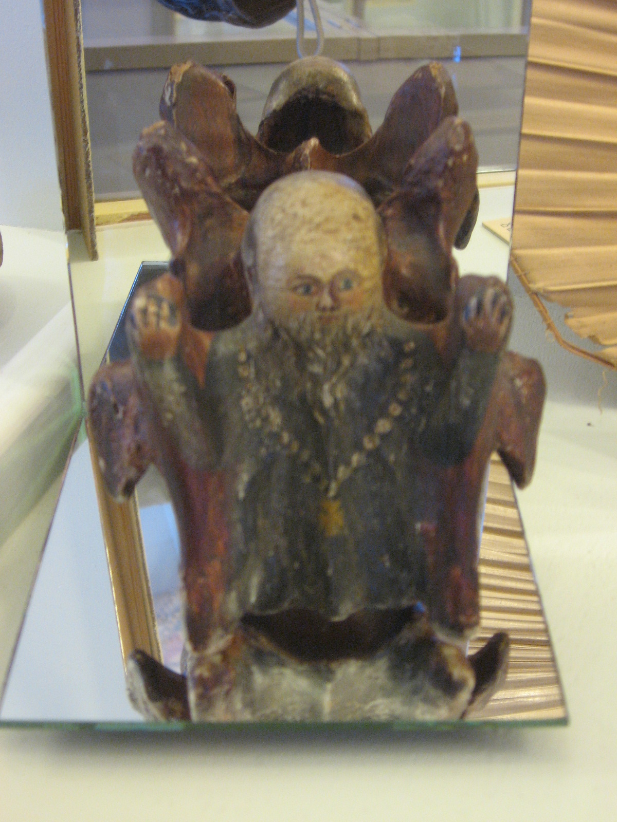 Kirkkosalin veistosten lisäksi kuulimme lyhyesti museon pienestä kiinalaisten esineiden kokoelmasta. Merimiesten ja matkalaisten tuomana on raahelaiskoteihin jo 1800-luvun puolella tullut runsaasti tuulahduksia kaukomaista. Museon yläkertaan on koottu matkamuistoja ja tuliaisia ulkomailta.