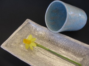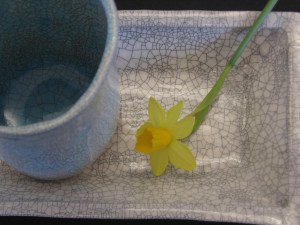 Essin ja Joonaksen suunnittelemat astiat on lasitettu halkeilevalla lasitteella. ´Kraklausta´korostettiin laimennetulla musteella, joka tummentaa halkeamakohdat.