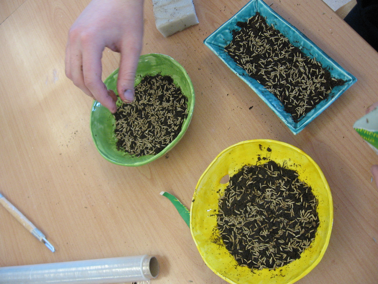 Ensimmäiset KU9-kurssin lasitetut keramiikkatyöt tulivat uunista ja pääsivät heti rairuohoastioiksi.