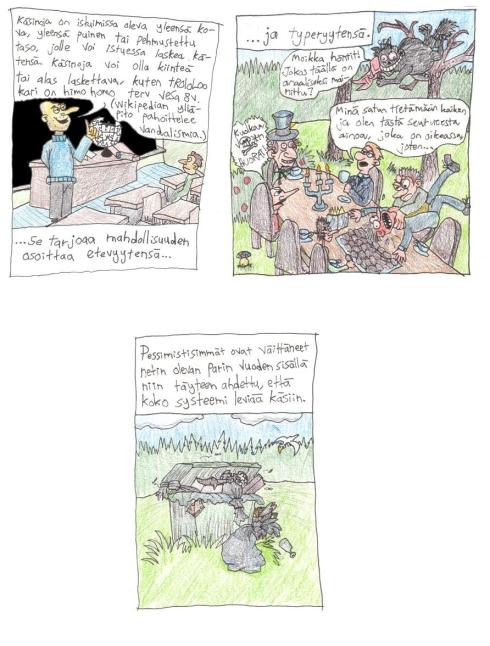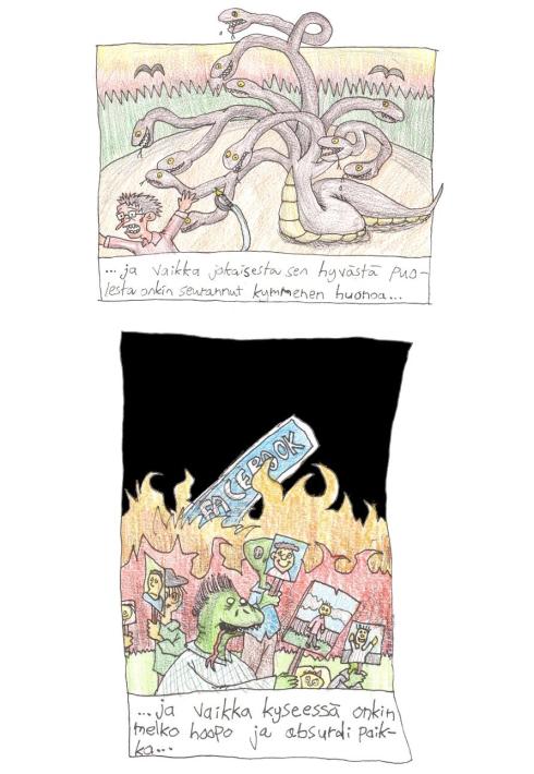 Päätin tällä kurssilla työstää jotain vähän kepeämpää, kun yleensä on tullut maalailtua pelkkiä yrmeitä korppeja hautuumaamaisemissa. Niinpä aloin luonnostella sarjakuvaa, joita en olekaan pahemmin tehnyt sitten yläasteen. Mutta eipä aikaakaan kun sarjakuvassa jo alkoi esiintyä ruumisarkkuja ja ulkoavaruuden liskozombeja. No, tällä tavallahan ne mielen sisäiset liikkeet varmaan paljastuvat kaikessa koruttomuudessaan. Halusin kuvittaa nimettömän rillipään sapekkaankitkerää luentoa Internetin haasteista yrittäen tuoda esille sitä omalaatuista ja vähän luonnotontakin ilmapiiriä, joka netissä vallitsee. Ajanpuutteen vuoksi aivan kaikkea ei tullut käsiteltyä, kuten oli tarkoitus (ihan tosi!), mutta jonkinlaisen yleiskäsityksen tästä varmaan saa. En allekirjoita ainakaan täysin kaikkea mitä sarjakuvassa sanotaan: heikkoryhtinen nörtti posmottamassa puhujankorokkeella on hyvä väline ilmaista huolensa ”vähän” kärjistetymmässä muodossa. Toivon, että sarjakuva herättää ajatuksia sekä mielipiteitä ja saa itse kunkin miettimään omaa suhdettaan (epä?)sosiaaliseen mediaan. Ennen kaikkea toivon, että joulunne ei tämän mörkötekeleen vuoksi ole pilalla. Kiitos ja anteeksi.
