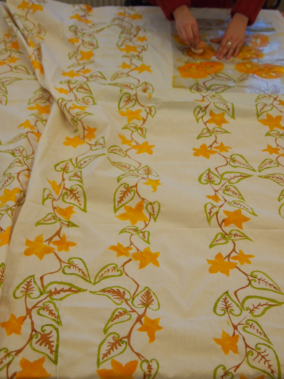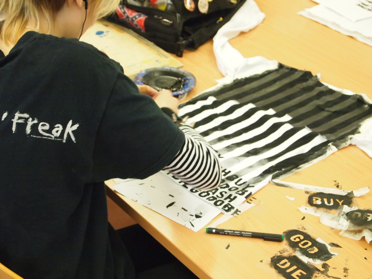 KU7/12 Kankaanpainokurssilla tehtiin joulukuussa paljon töitä pukinkonttiin, omaan huoneeseen tai lukiolaisten mielessä häämöttävään, tulevien vuosien opiskelijakämppään. Tekniikkaharjoituksia syntyi mm. sabloonapainannalla, taikinatekniikalla ja palikkapainannalla. Tekniikkaharjoitusten jälkeen jokainen suunnitteli, luonnosteli ja toteutti mieleisensä lopputyön. Lopputyössä täytyi olla useimmille kankaanpainokuvioille tyypillistä TOISTOA.