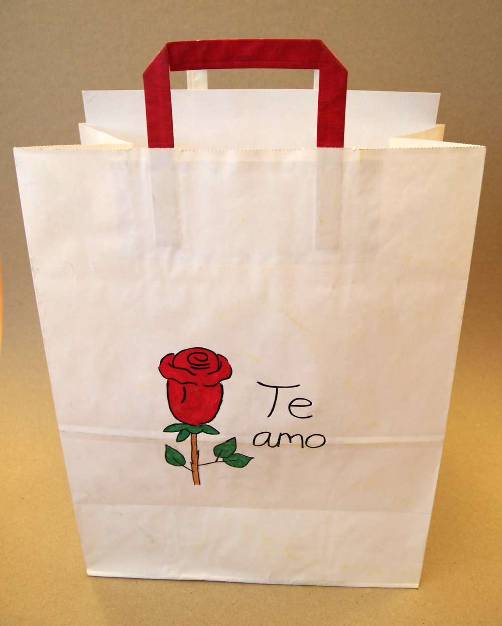 KU2- kurssilla tehtiin paperikasseihin logoja ja liikemerkkejä. Lähtökohtana kuvalliselle tunnukselle oli MINÄ RAKASTAN SINUA jollakin kurssilaisen valitsemalla kielellä. Voiko kuvallisesti kertoa rakkauden luonteesta: rakkaudesta luontoon, tiettyyn maahan, toiseen ihmiseen?