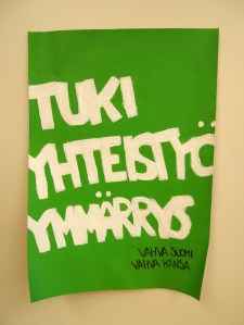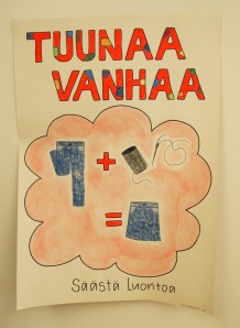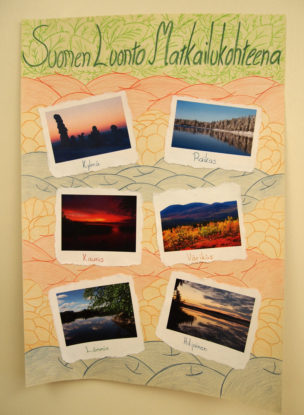 Jemina: Tavoitteena oli löytää hyviä Suomen luontokuvia, onnistua marjojen piirroksissa. Onnistuin tavoitteessani hyvin. Lehdet onnistui yllättävän hyvin. Kaikki on onnistunut hyvin, mutta jos jotain tekisi... niin olisi voinut laveerata koko taustan. Juliste on värikäs, hyvin sommiteltu, revityt kuvat sopii hyvin.