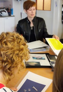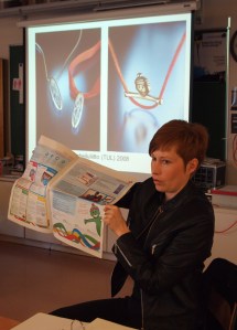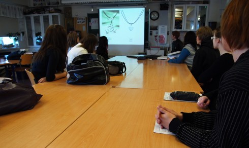 Opiskelijat kuuntelivat kiinnostuneina korujen suunnittelun käänteitä ja kertomuksia suunnittelun taustalla.