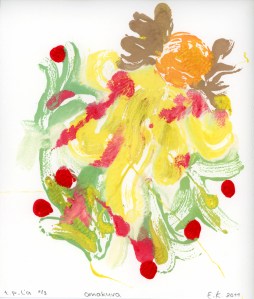 Toisessa tekniikassa maalattiin linoväreillä lasille ja telaamalla siirettiin kuva paperille. Aiheena oli omakuva, omakuvat ovat taiteilijoiden keskuudessa melko yleinen aihe. Painotin että omakuvan voi tehdä monella tavalla, se mitä peilistä näkyy ei välttämättä ole paras itsensä ja omien tuntemusten näyttämiseen, vaan värejä, abstrakteja muotoja, symbolisia kuvia voi aivan hyvin käyttää. Koko opettamiseni ajan toivoin että oppilaat löytäisivät omanlaisensa tekemisen pelkän suorittamisen sijasta. Oli ilo nähdä miten opiskelijat tykkäsivät opettamistani menetelmistä ja miten upeita töitä syntyi toinen toisensa perään! Paras palkinto täällä töissä ollessa oli opiskelijoiden onnistumisen ilo ja oman luovuuden löytäminen.
