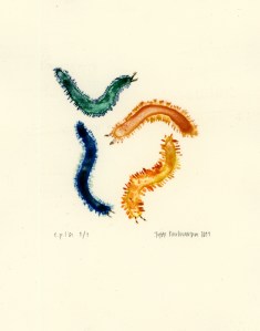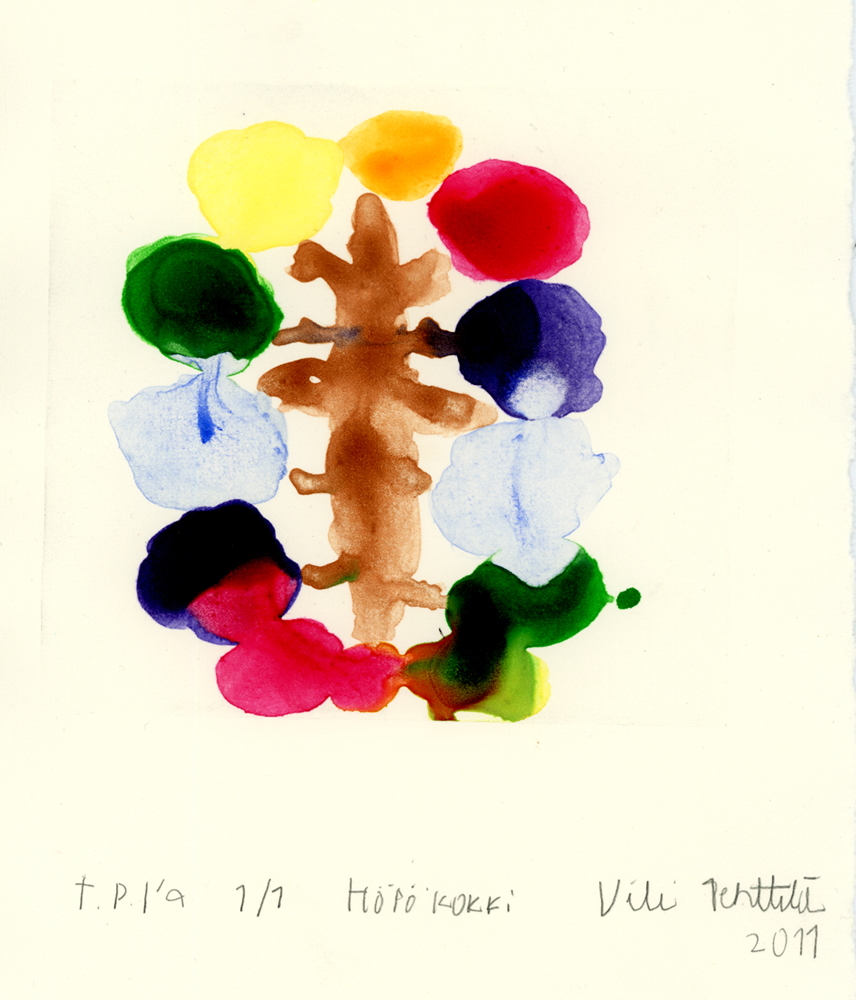 Työtehtäviini kuului lähinnä oppilaiden auttaminen tarpeen vaatiessa sekä yleisestä siisteydestä huolehtiminen. Otin myös paljon valokuvia tätä blogia varten sekä tein paljon omia pieniä projekteja maalaamisesta keramiikkaan. Viimeisessä jaksossa pääsin enemmän tositoimiin KU4-kurssin kanssa, sain suunnitella sisältöä kurssille ja opettaa opiskelijoille monotypiaa, helppoa ja yksinkertaista keinoa tehdä taidegrafiikkaa. Aluksi opettaminen jännitti kamalasti, sillä käyttämämme tekniikat eivät minulle olleet entuudestaan kovinkaan tuttuja. Kurssin edetessä sain kuitenkin varmuutta opettamiseen ja kaikki meni varsin mainiosti. Monotypiaa voi tehdä monella eri keinolla, opetin kaksi tekniikka. Toisessa maalattiin suoraan offset-pellille akvarelliväreillä ja laatat vedostettiin syväpainoprässillä paksulle paperille. Aiheena olivat bakteerit ja virukset. Tahdoin antaa aiheen, joka ei olisi kamalan yksipuoleinen ja jota voisi toteuttaa monelta eri kantilta – täysin abstarktisti tai sitten realistisesti.