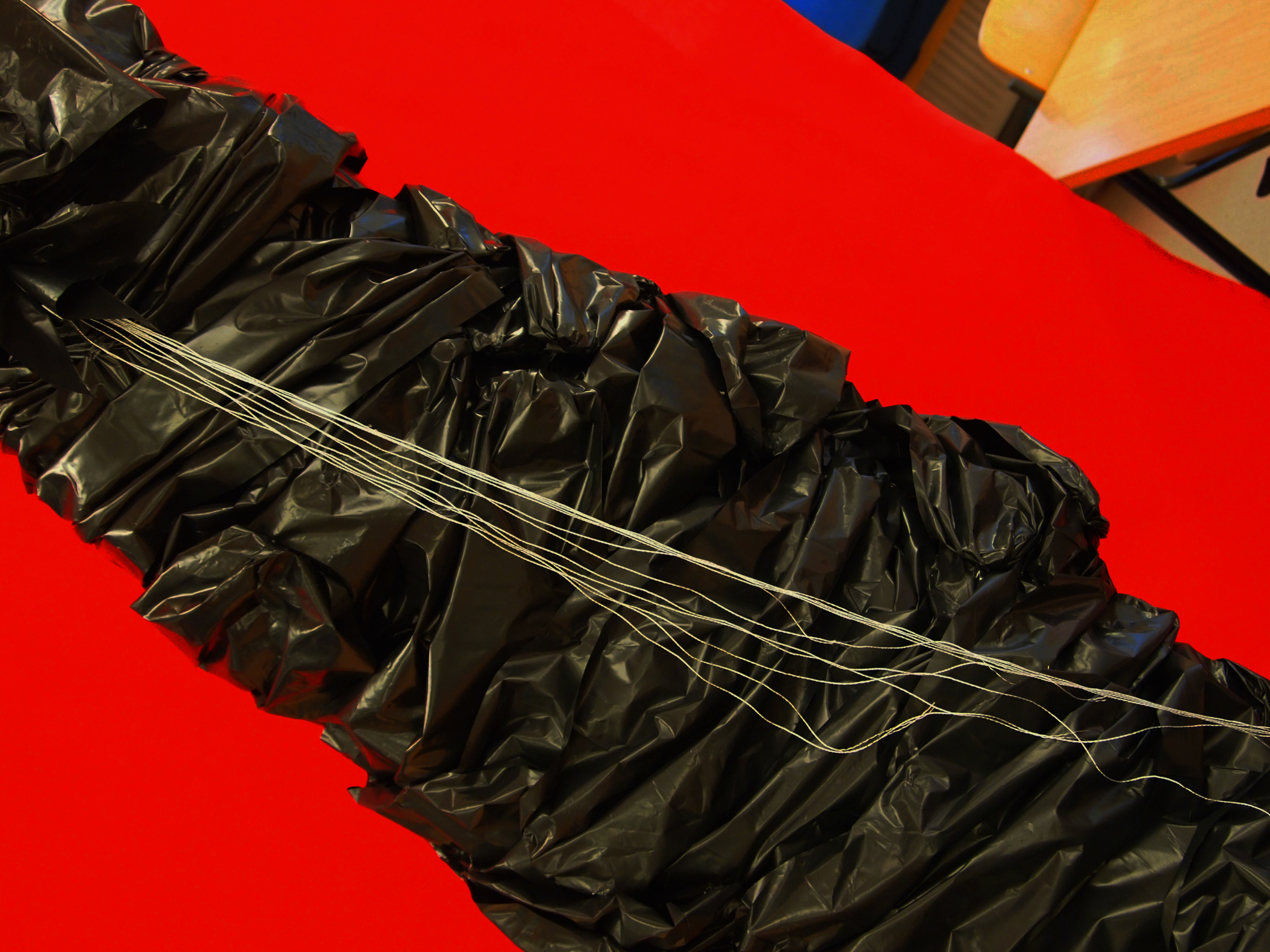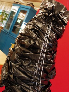 Ensin mietin että teen oikeen hienon kokopitkän iltapuvun kirkkaista muovipusseista, mutta ajan ja energian säästämiseksi valitsinkin hieman epäläpikuultavamman materiaalin, jätesäkin. Aluksi tuskailin naisvartalomallin kanssa ja pilasin kynteni kanaverkkoon, ja sen jälkeen kirosin jeesusteipin alimpaan helvettiin, koska sen mainostaminen on ollut virheellistä. Se ei nimittäin toiminut tässä yhteydessä sitten olleskaan. Pari kertaa puoliksi kokoon koko höskän liimattuani päätin vaihtaa kiinnitysmateriaalin kuumaliimaan, joka toimikin noin tuhatsataprosenttia paremmin kuin jesari. Toisaalta se oli myös vaarallisempaa, sillä poltin näppini moneen kertaan prosessin aikana. Laahus tuli hiukkasen väärään kohtaan koska olen tämmönen hippaheikki enkä jaksanut katsoa mihin sen tuikkasin, mutta kyllä se tuossakin toimii ihan yhtä hyvin. Huonoa tässä koko tuskassa on varmaan se että rakensin sen kokonaan kanaverkkosysteemin ympärille, eikä sitä voi pukea päälle. Toisaalta jos sen pukisi päälle niin se varmaan hajoaisi atomeihin. Rusettiin lisäsin roikkumaan hopeanauhaa ihan vain siksi ettei se olisi ihan niin tylsä, ja ajattelin värkätä siihen jotku asusteet (kaulakorun, käsirenkaat) mutta sitten muistin etten ole hopeaseppä. Itse ainakin käyttäisin tätä jos se ei olisi niin hauras, ja tosiaankin liimattu kanaverkkoon kiinni.