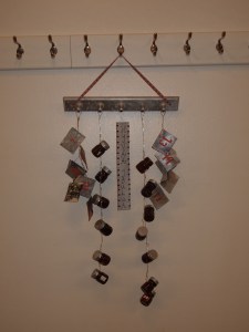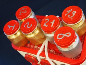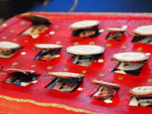 Joulukalenteri on tehty tietokoneen styroksisesta pakkaussuojasta. Annika ja Sanna-Kaisa ovat tehneet monimuotoiseen kalenteriin erilaisia luukkuja.