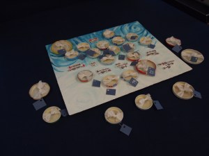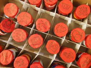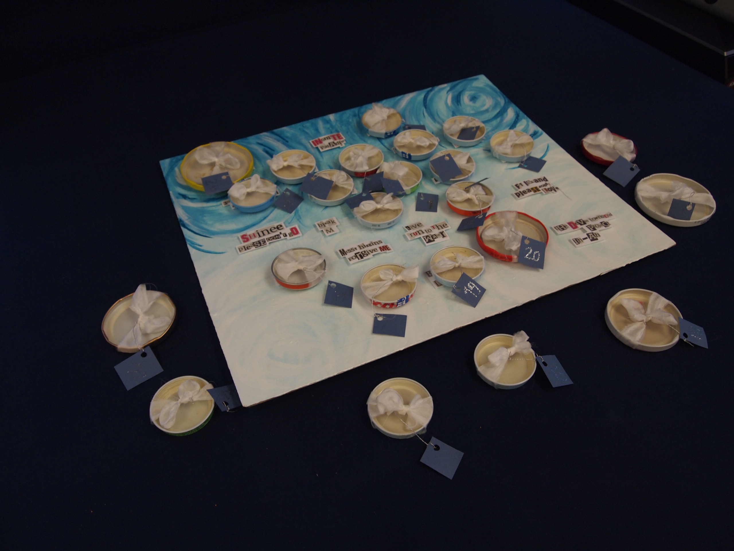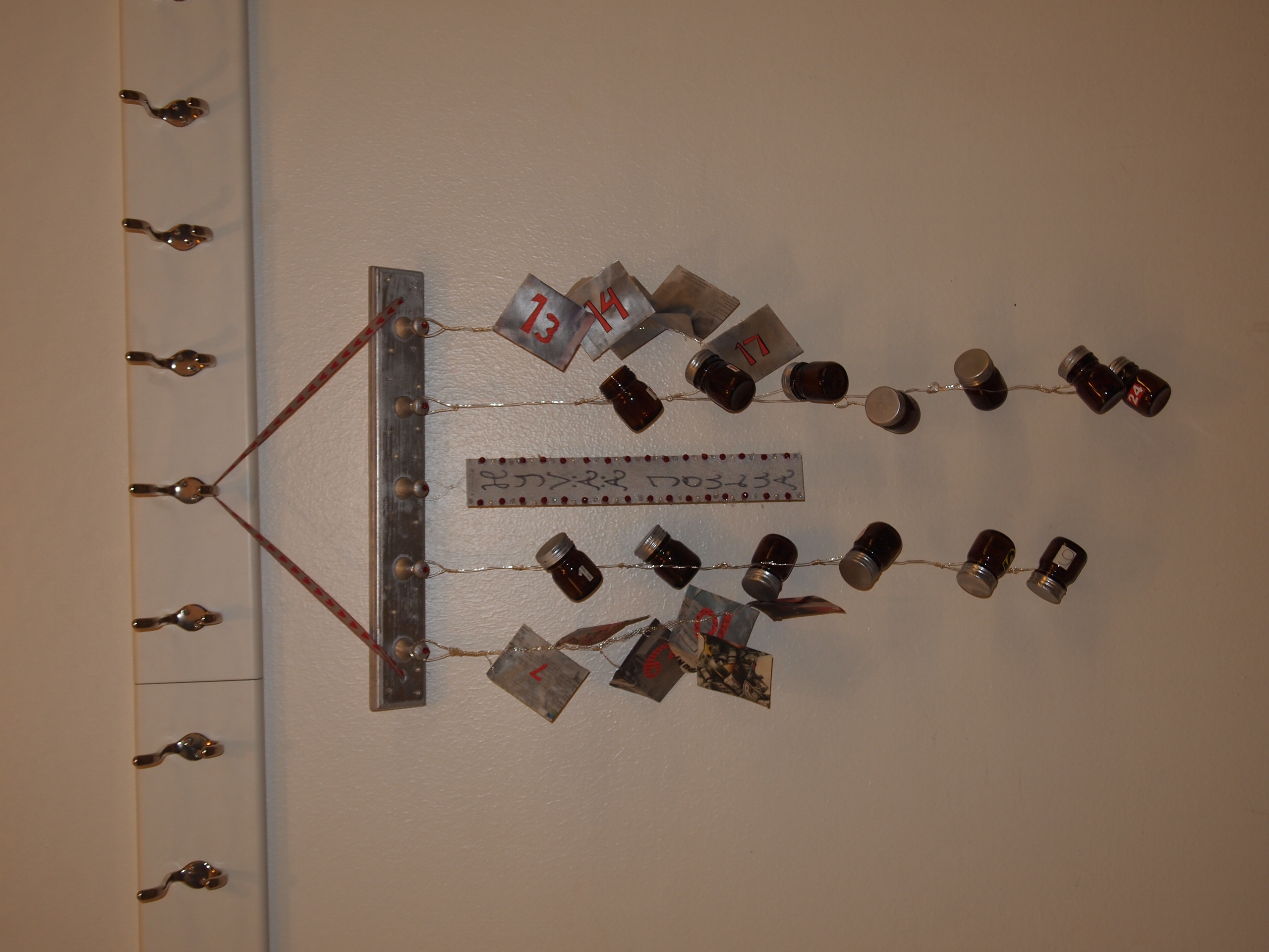 Lähdin rakentamaan joulukalenterin ideaa siitä, että halusin luukuiksi pilttipurkkien kansia. Vähän funtsittuani tajusin että nehän ovat jonkin sorttista metallia, joten nehän voi kiinnittää magneeteilla johonkin vanerinpätkään. Anastin siis varastosta monta kertaa alustana käytetyn kovalevyn ja maalasin sen sinivalkoiseksi. Aluksi ajattelin tehdä taustasta hieman taiteellisemman mutta siihen ei olisi ollut aikaa, ja on se nuinkin tosi hieno. Luukkujen ”yllätyksiä” mietin pitkään, ja runojen sanoista ja ties mistä päädyin biiseihin. Jokainen biisin nimi on leikattu kirjan kerrallaan sanomalehdistä, ja ne on liimattu käytetylle luonnospaperille. Pilttipurkkien kannet on paketoitu jämäsilkkiin ja numerolaput tehty niin ikää jämäpahvista. Biisit on enimmäkseen englannin kielisiä, mutta kovana aasian ystävänä ujutin mukaan myös korealaisia lempibiisejäni. Työn nimi on ”iCalendar” näin musiikkihengessä. Emmi