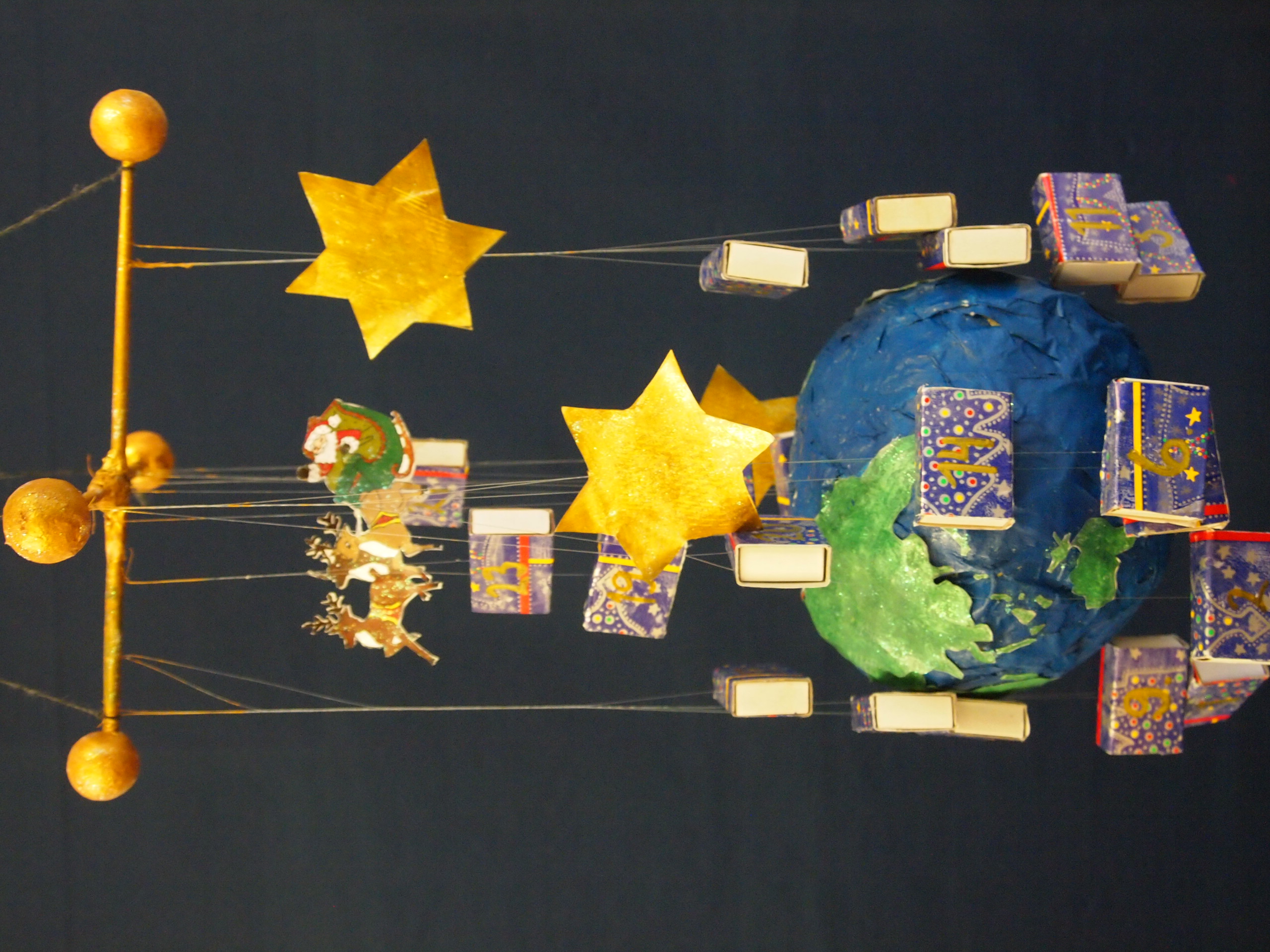 Aloitimme kalenterin rakentamisen etsimällä netistä tietoja eri maiden jouluperinteistä ja niihin liittyvistä hahmoista. Tietojen keräämiseen meni kauan aikaa ja samalla etsimme kotoa tyhjiä tulitikkurasioita, joista teimme kalenterin ”luukut”. Valmiit jouluperinne tietolaput tulostimme ja liitimme ne kuvan kanssa laatikoihin. Laatikot päällystimme mummolasta löytyneellä käytetyllä lahjapaperilla. Numerot laatikoihin teimme kultatussilla. Maapallo syntyi kanaverkosta, jota käytimme apumuottina ja tukena. Verkon päällystimme liimaliisterillä liimatuilla sanomalehden palasilla. Värjäsimme maapallon siniseksi ja liimasimme itse piirretyt vihreäksi väritetyt maanosat palloon. Tukipilarit teimme vanhoista pensseleistä, joihin lisäsimme kimallemaalia. Pensseleiden päähän lisäsimme jo ennen käytetyt styroksipallot, jotka saivat myös kultaisen värin. Maapallon sekä laatikot kiinnitimme pensseleihin ohuella siimalla. Tähdet tehtiin vanhan kirjan sivuista ja nekin maalasimme kullalla. Joulupukki ja porot ovat arvoitus? Saimme maapallon tasapainoon villalangan pätkillä, jotka yhdistimme uuten lankaan ja teimme loppuksi lankaan kiinnityslenkin. Loppusilaukseksi lisäsimme kimalletta koko kalenteriin. Laura ja Marja