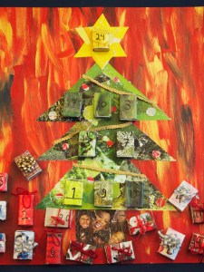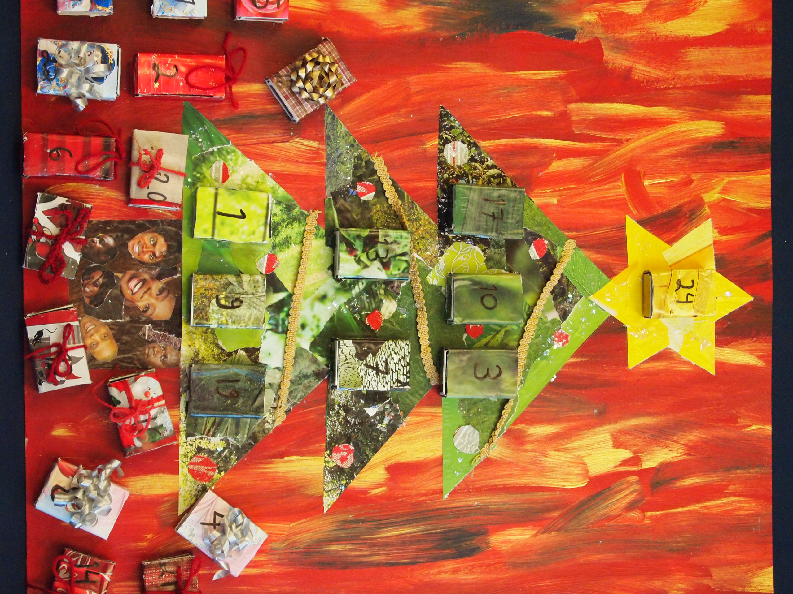 Ensin suunnittelimme työtä tarkoin ja huolellisesti. Sen jälkeen maalasimme isoa pahvinpalasta punaisella, kultaisella ja sinisellä maalilla. Maalaamisen jälkeen revimme lehdistä ruskeaa, vihreää ja keltaista väriä. Vihreistä lehdenpalasista teimme kuusen, keltaisista kuusen latvaan tähden ja ruskeista palasista kuusen rungon. Piilotimme tyhjiin tulitikkurasioihin pieniä leluyllätyksiä ja paketoimme rasiat lehdistä leikatuilla palasilla ja käytetyllä lahjapaperilla. Sen jälkeen laitoimme paketteihin lahjapaperinarut. Sitten liimasimme paketit kalenteriin ja kirjoitimme paketteihin numerot. Lopuksi lisäsimme työhön ”pikkuhienouksia” kuten mm. kimalletta ja koristelimme kuusen kankaanpalasin ja kangasnauhoin. Atte, Annika ja Tommi