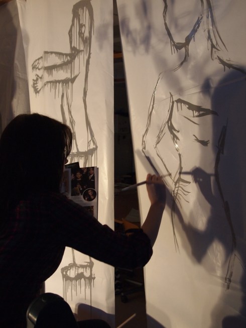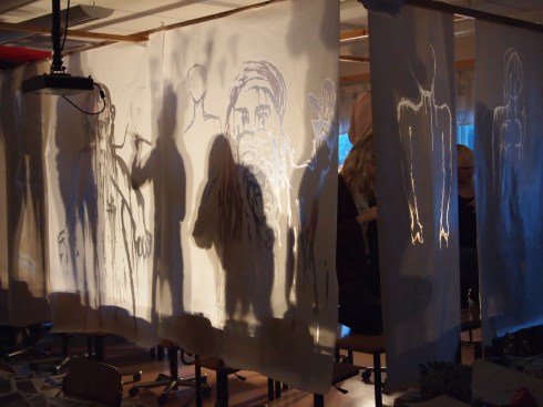 KU8 -kurssilaiset maalasivat joulukuun aamupimeydessä varjomaalauksia. Etsimme ensin kuvia ihmisistä uutisista, mainoksista ja taidekirjoista. Luokkaan ripustettiin kaava- ja makulatuuripaperia. Sytytimme kaksi rakennustyömaavaloa papereiden taakse. Kiipesimme pöydälle maalaamaan ruokaöljyllä ja vedellä ihmishahmoja kuvien pohjalta anatomiaa tutkien.