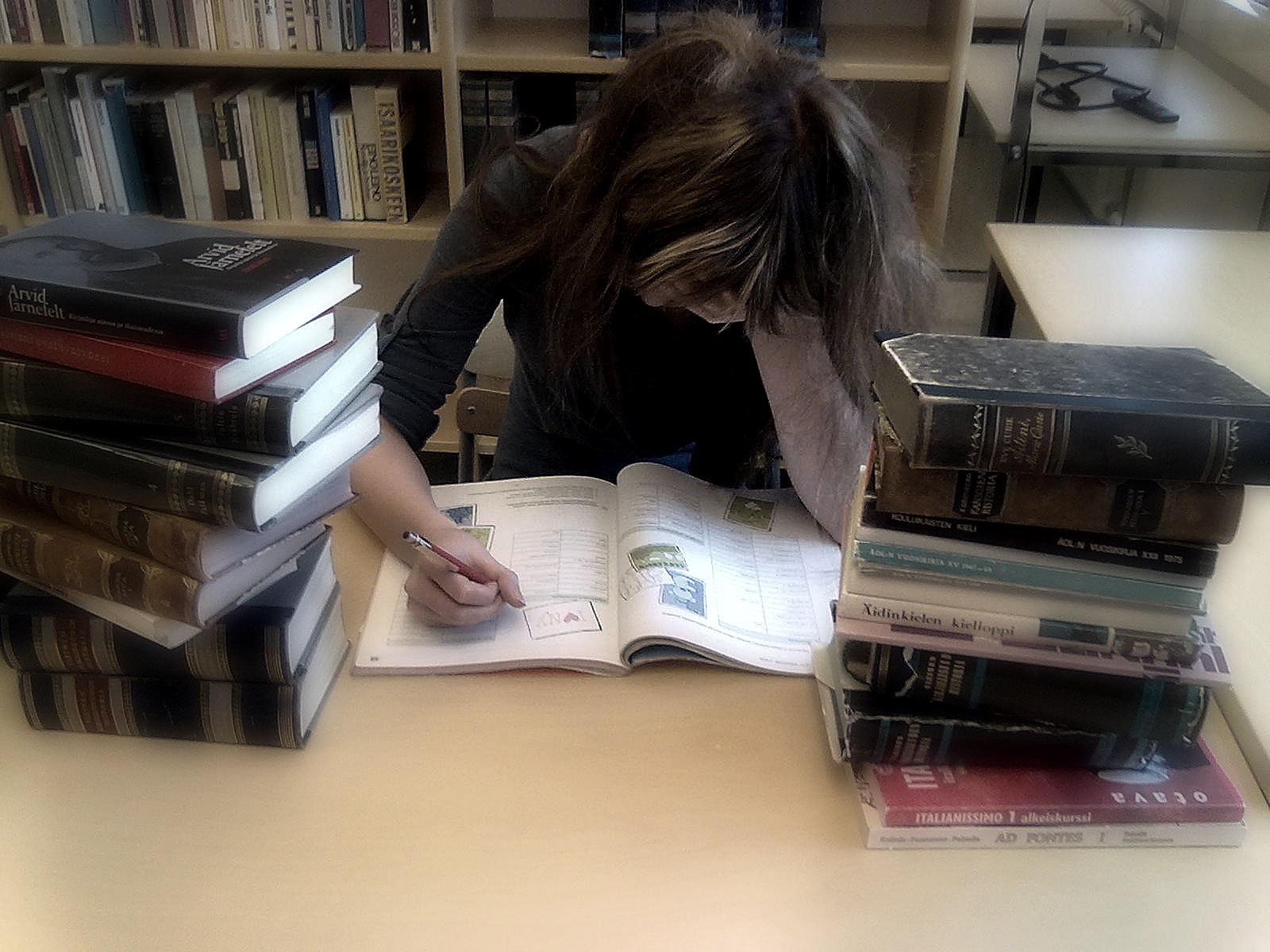 Toisessa kuvassa nuori opiskelee väsyneenä nojaten käteensä ja tekee tehtäviä kirjapinon keskellä. Nuori viettää suurimman osan ajastaan koulussa opiskellen ja välillä se voi olla hermoja raastavaa. Kuva on hieman harmahtava ja sumea, luoden väsynyttä ja laimeaa tunnelmaa.