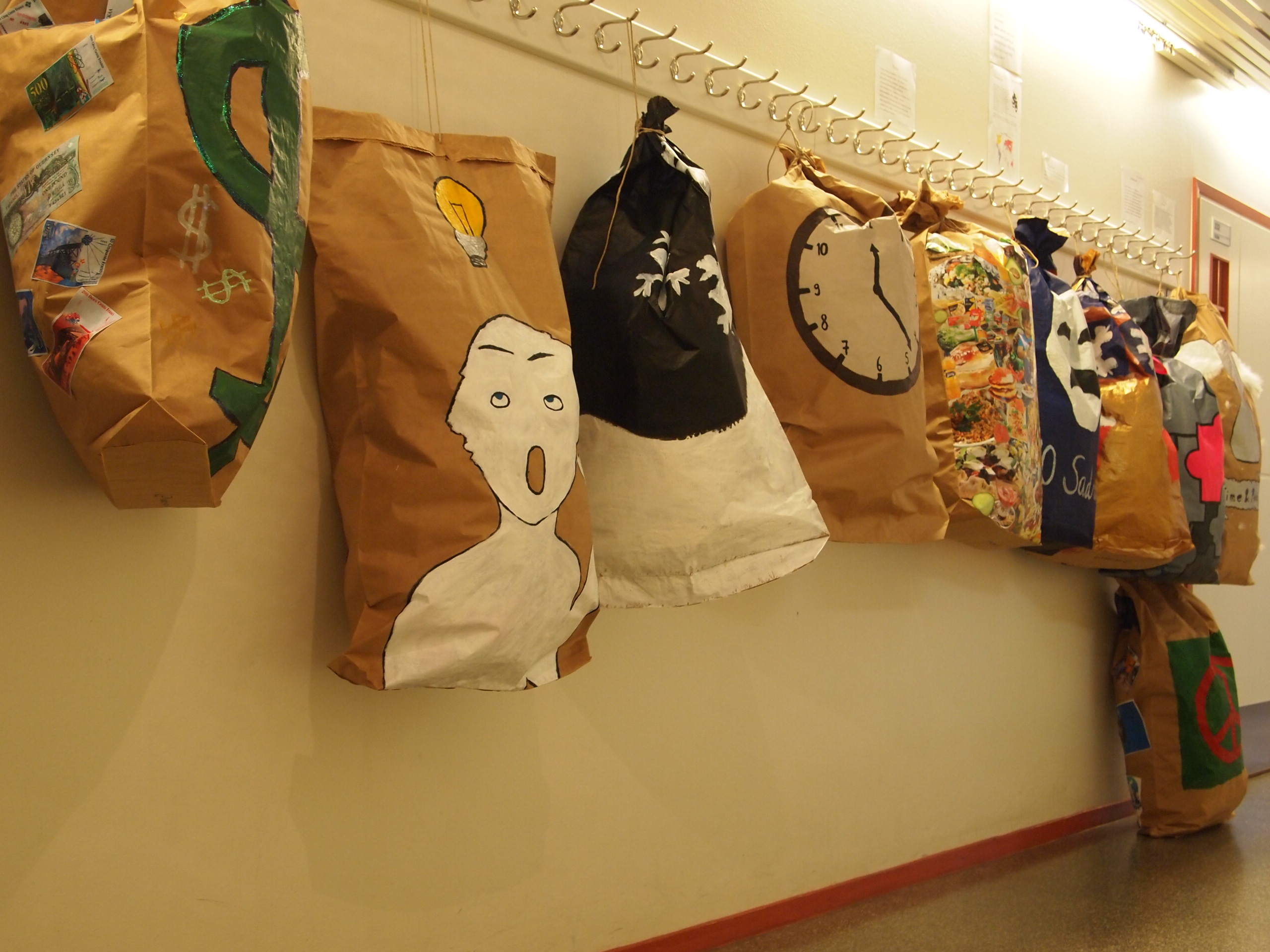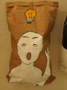 Säkkiin pakattu: Paljon inspiraatiota. Inspiraatio tärkeää, jotta saisi kuviksessa hyviä ja luovia ajatuksia. Valkoinen mies kuvassa keksii jotain ja saa Ahaa! –elämyksen (huomaa lamppu, etusormi ja ilme). KU2 Saku ja Jesse