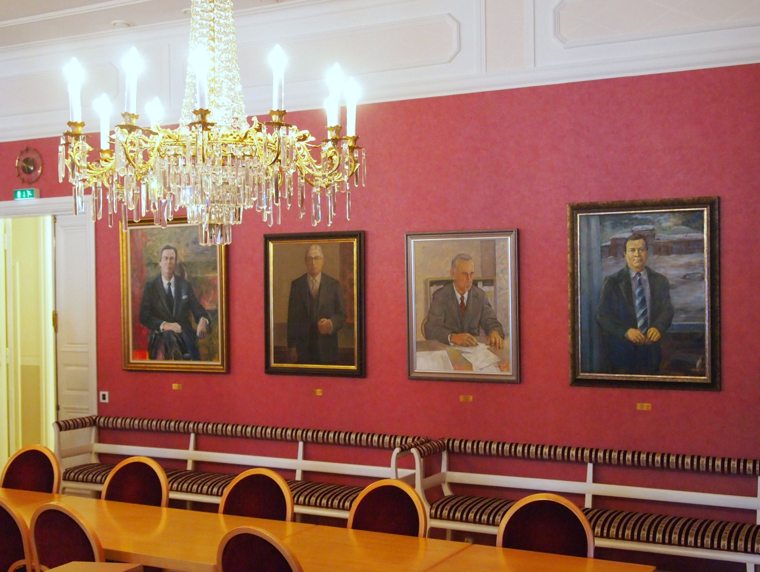 Tunnetuin huoneen taiteilijoista lienee Eero Järnelfelt, jonka vuonna 1921 maalaama muotokuva vuorineuvos Arthur Lagerlöfistä on saattanut vaikuttaa siihen, että samaiselta taiteilijalta tilattiin myöhemmin suurikokoinen alttaritaulu Raahen kirkkoon. Kaupungille suurlahjoituksen tehneen Lars Fredrik Leufstadiuksen muotokuvan on maalannut Arvid Liljelund. Kaupunginjohtajien muotokuvia ovat maalanneet Hannu Kaakko, Niilo Hyttinen, Paavo Tolonen ja Oma Orell.