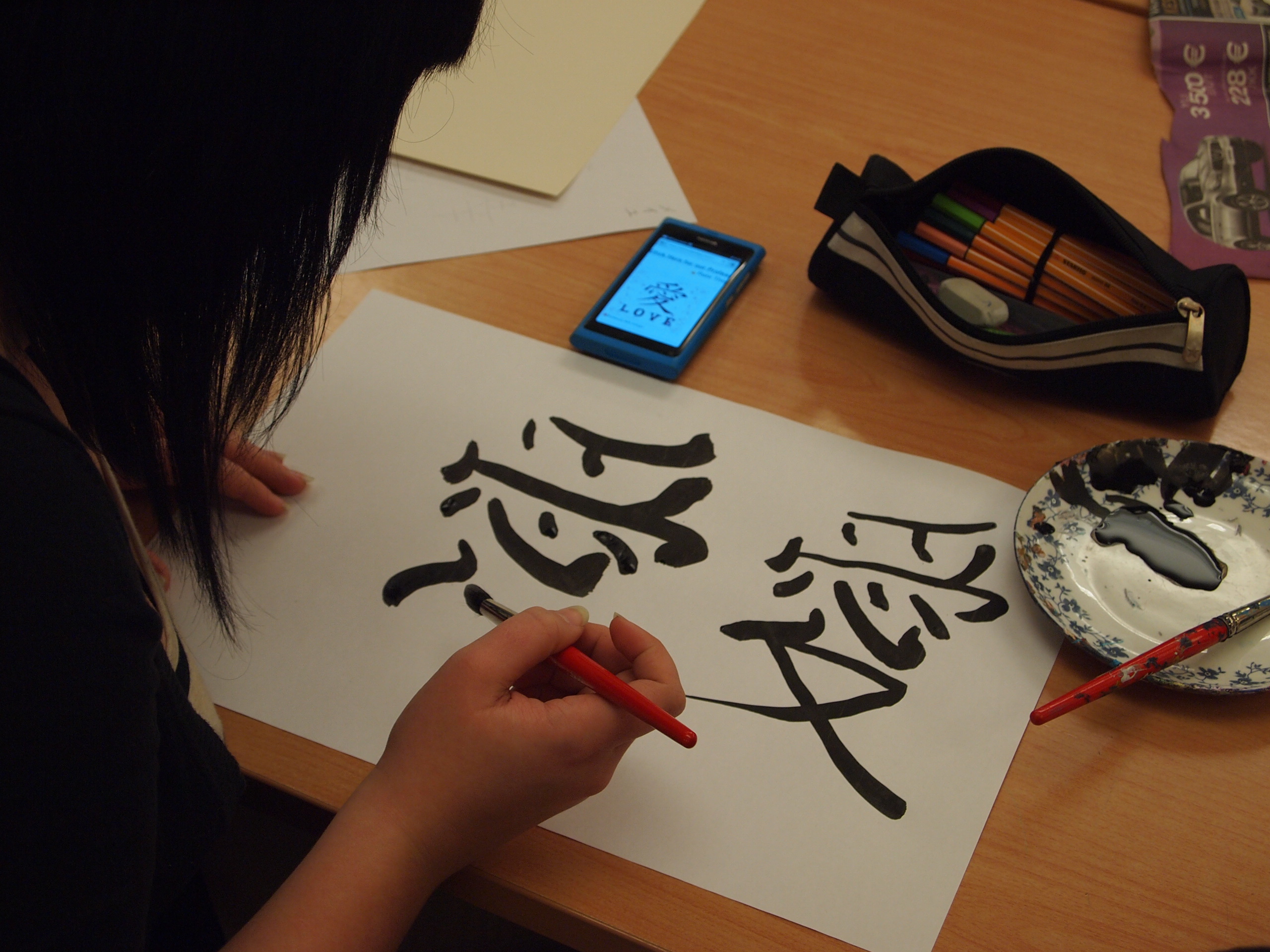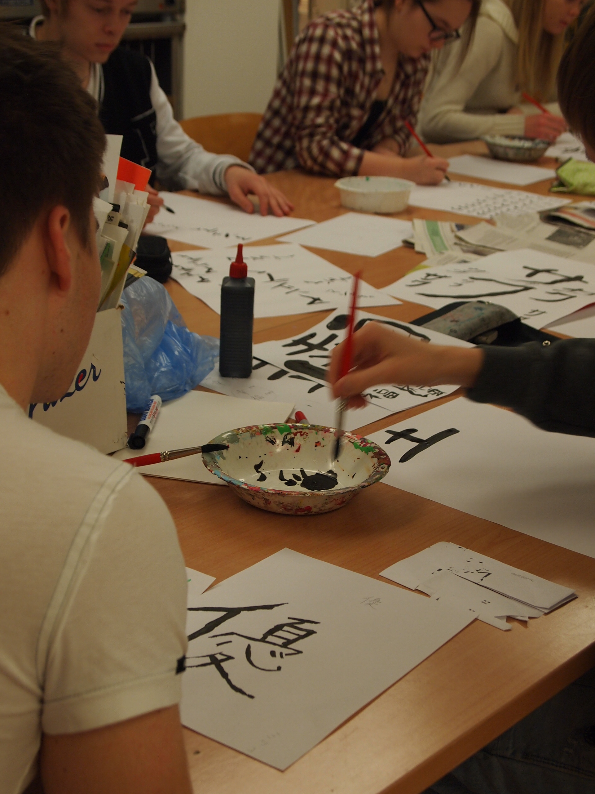 Opiskelijat tekivät japanilaisin kirjoitusmerkein oman nimensä ja miettivät toiveita uudelle vuodelle, kuten Japanissa on tapana. Shoko auttoi toiveiden kääntämisessä japanilaiseksi kirjoitusmerkiksi. Toiveissa vilahtelivat RAKKAUS, ONNI, RAUHA, RUOKA, RAHA, YSTÄVYYS ja jopa YLIOPPILAAKSI VALMISTUMINEN. Kuuntelimme kalligrafiaa harjoitellessa japanilaista musiikkia.