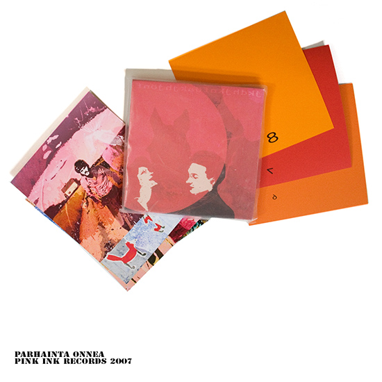 Kokeilemisen kautta. Ennen isompia canvakselle tulostettuja teoksia tein Turun taideakatemian kirjatyöpajassa Parhainta Onnea – Pink Ink Records 2007 ”kuvalevyn”, joka myötäilee ep-levyn formaattia. Käytin tähän teokseen vanhempieni ja isovanehmpieni vanhoja valokuvia: yhdistelin niitä melko räikeään ”Andy Warhol” maiseen värimaailmaan.