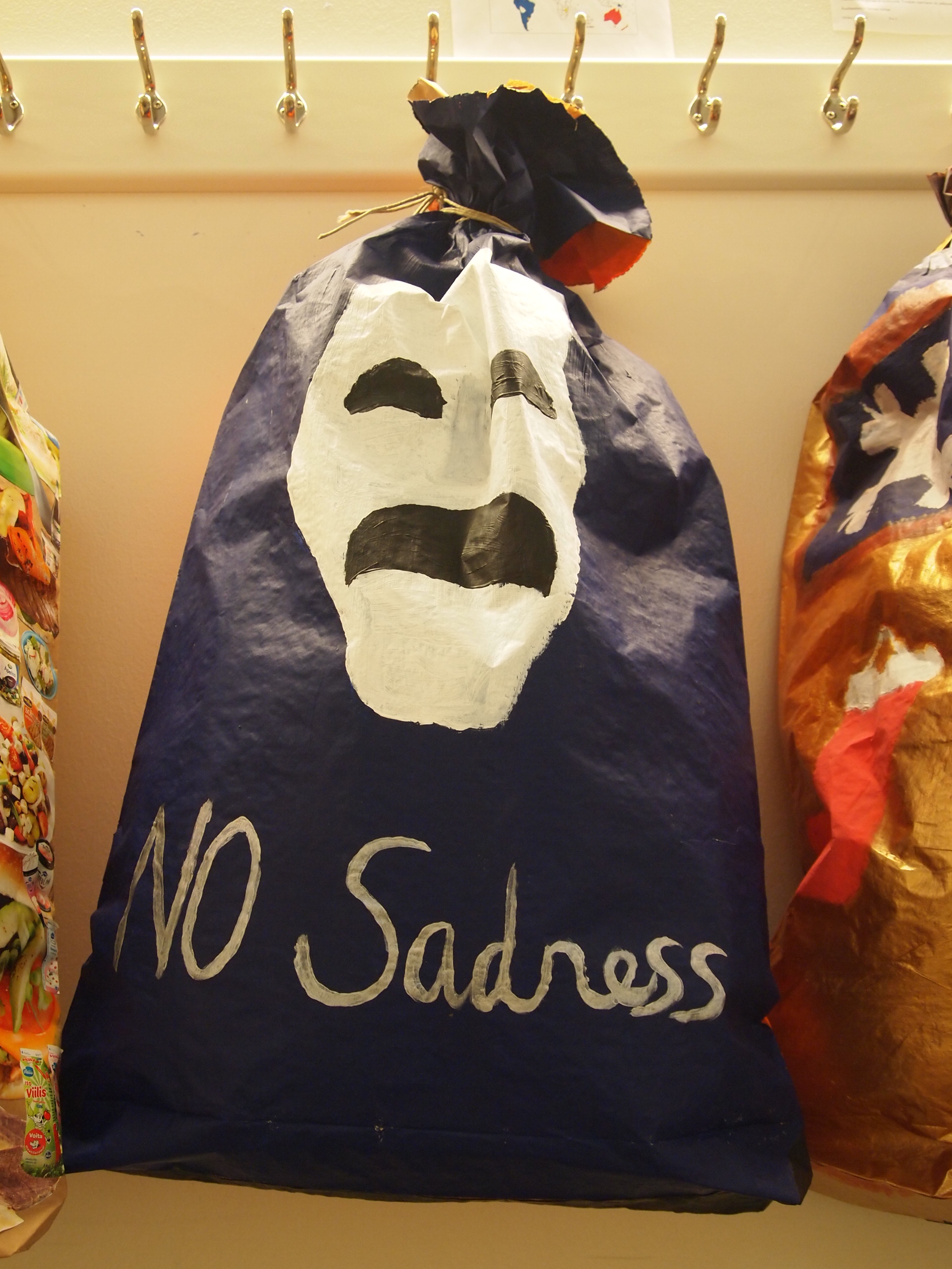 Säkkiin on pakattu iloa ja onnellisuutta. Pakattu asia on tärkeä koska, itsemurhien ja masennuksen määrä maailmassa on suuri. Ihminen voi sanoa olevansa masentunut, kun on alakuloinen. Sairaudeksi luokiteltava masennus eli depressio on kuitenkin eri asia. Depressio on yleinen ja edelleen alidiagnosoitu sairaus. Lähes jokaisella on jossain vaiheessa vaikeisiin elämäntilanteisiin liittyviä ohimeneviä mielialan laskun tai surun tunteita, mutta suurimmalla osalla tilanne ei pahene masennukseksi. Siinäkin tapauksessa, että masennus puhkeaa, se jää usein toteamatta. Vakavimmillaan masennus voi johtaa itsemurhaan.
