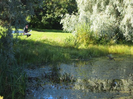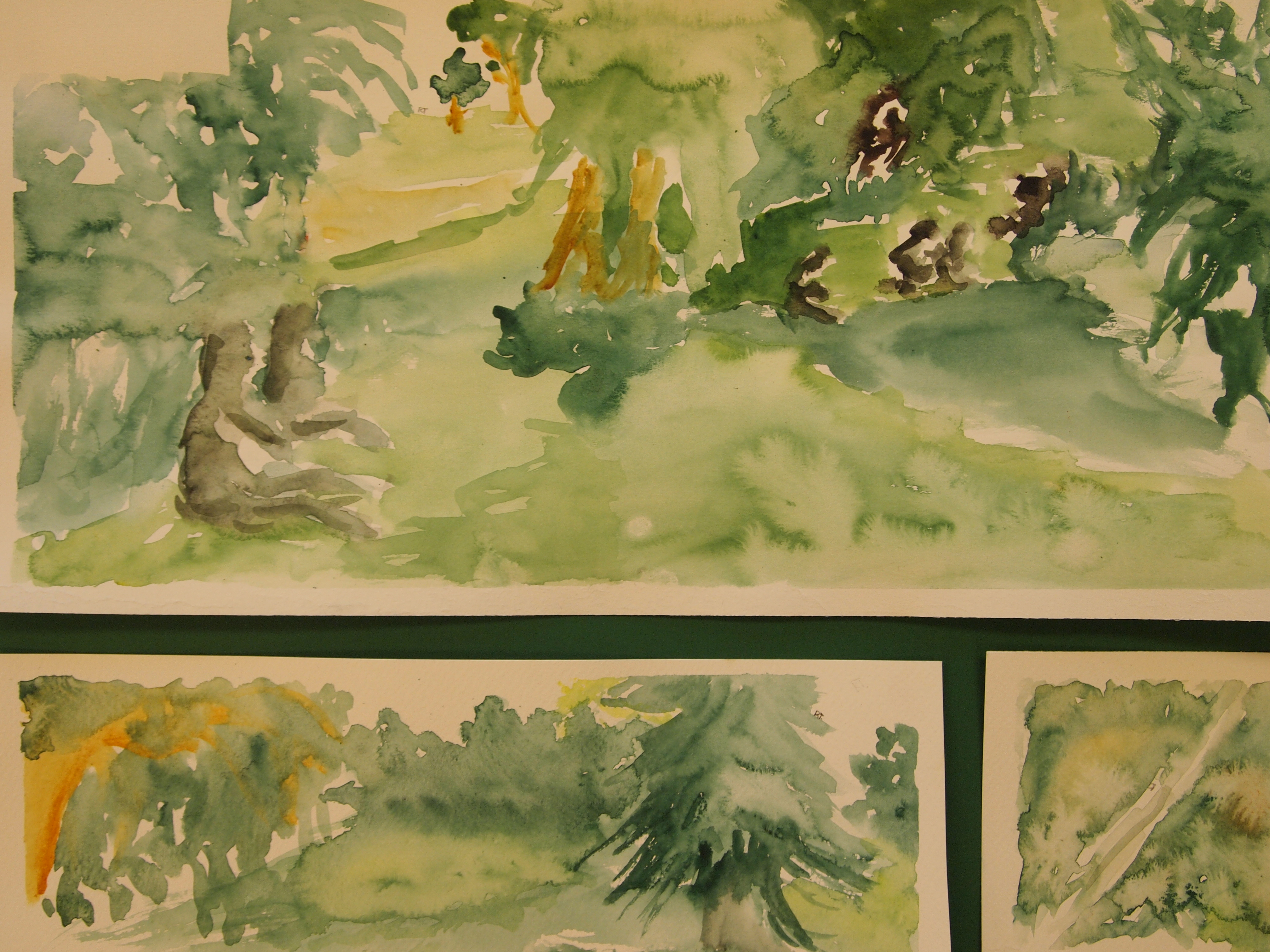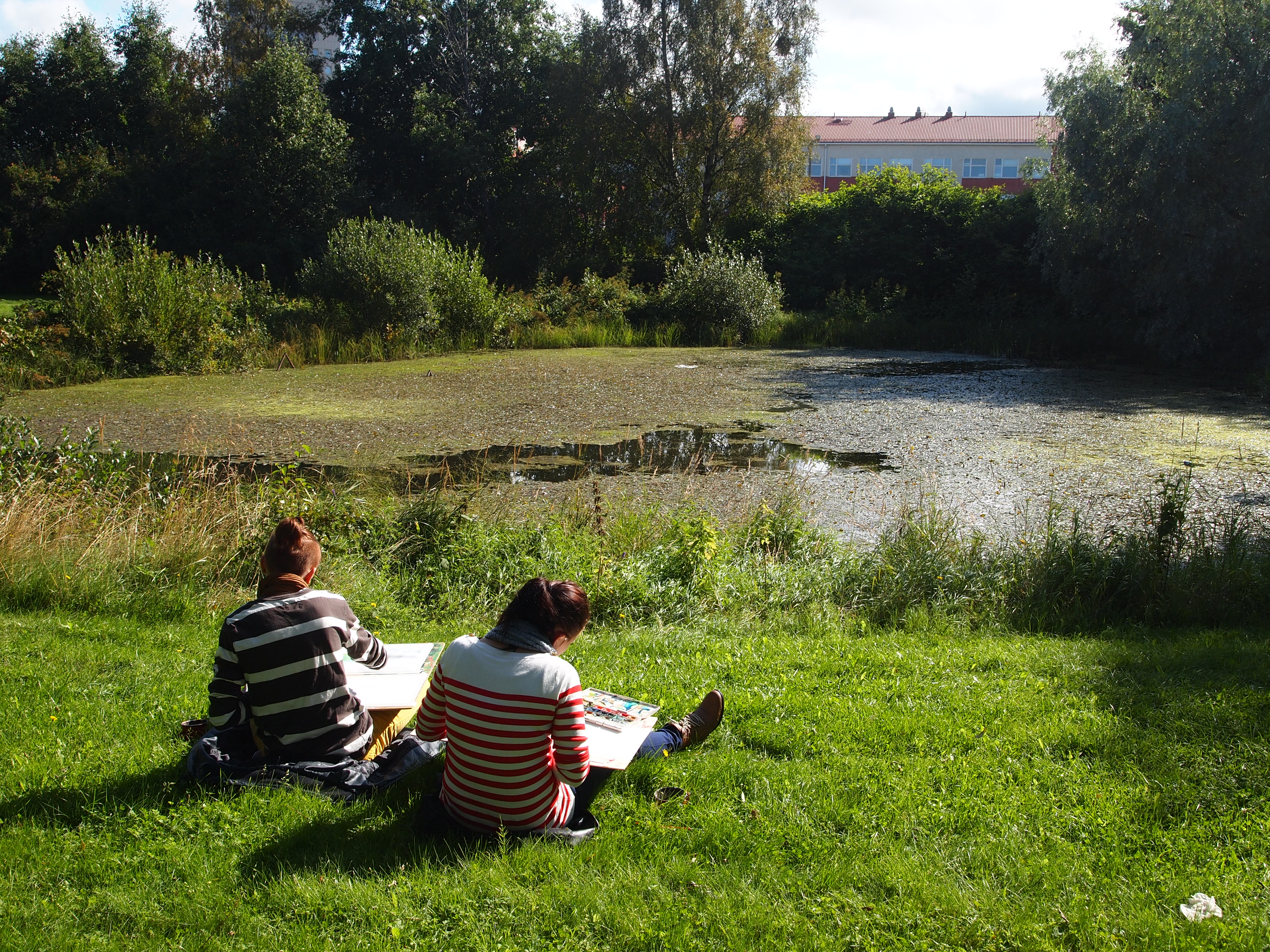 Elokuun aurinkoisena iltapäivänä maalasimme lukion takana sijaitsevalla lammella. Lammen pintaan heijastuvat hopeapajut. Sudenkorennot lentelivät akvarellistien yllä. Heijastukset väikkyivät lammen pinnassa kuten Claude Monet´n kuuluisassa Givernyn puutarhassa. Vangitsimme impressionismin hengen mukaisesti elokuisen iltapäivän mieliimme ja syntyneisiin akvarelliharjoitelmiin. Hyvällä mielikuvituksella lammelle saattaisi kuvitella Givernyn puisen sillan ja Monet´n lummekasvustot. 😉