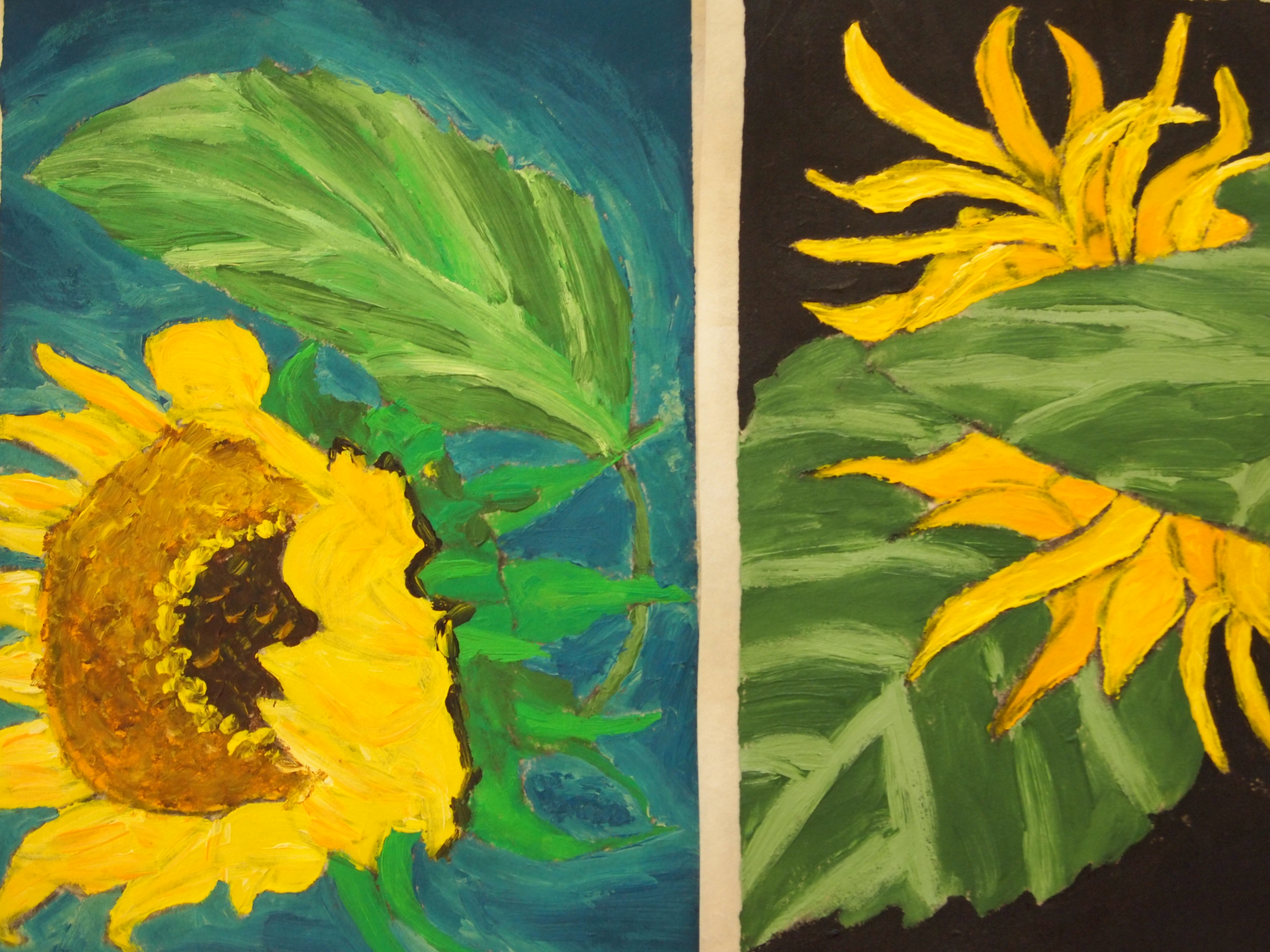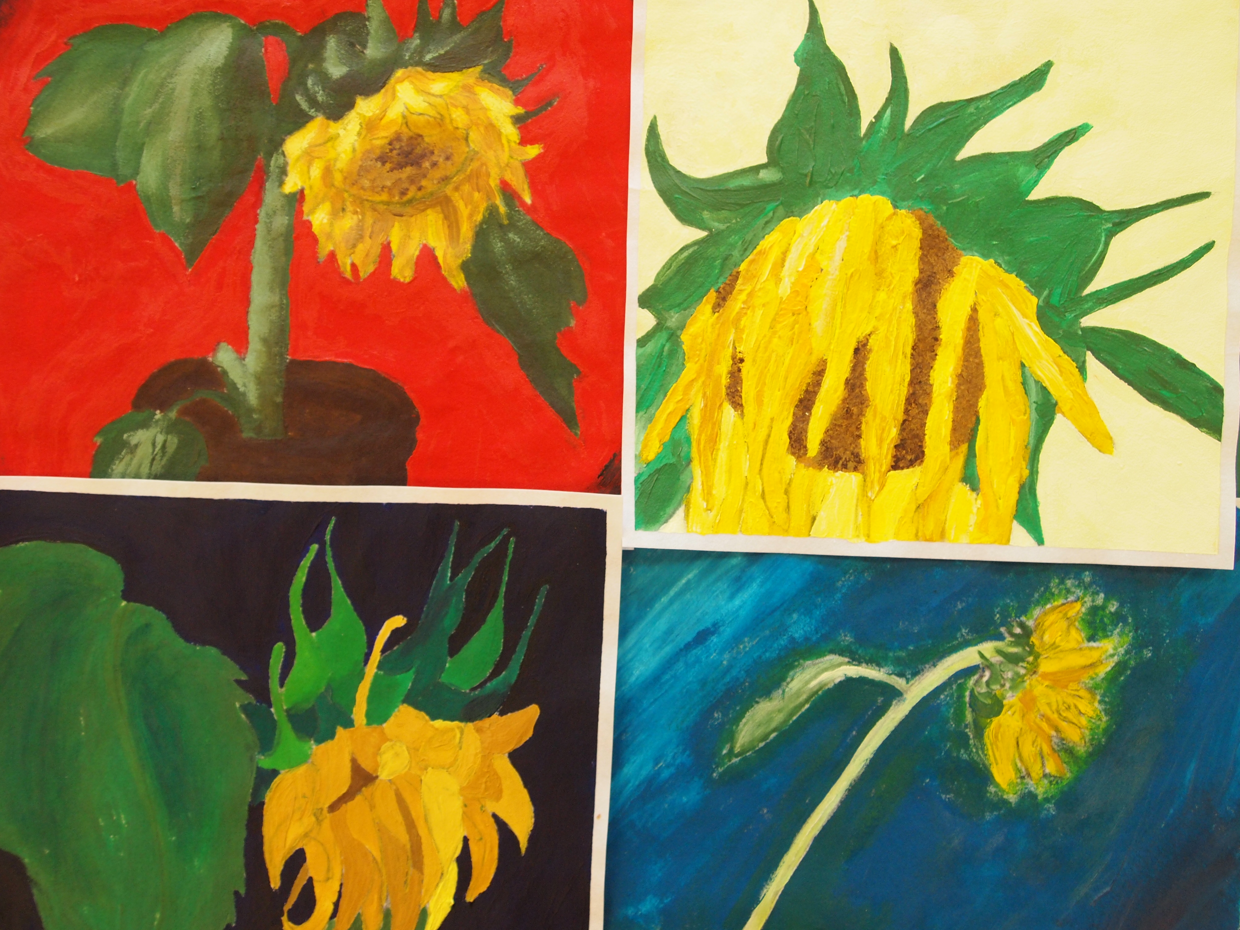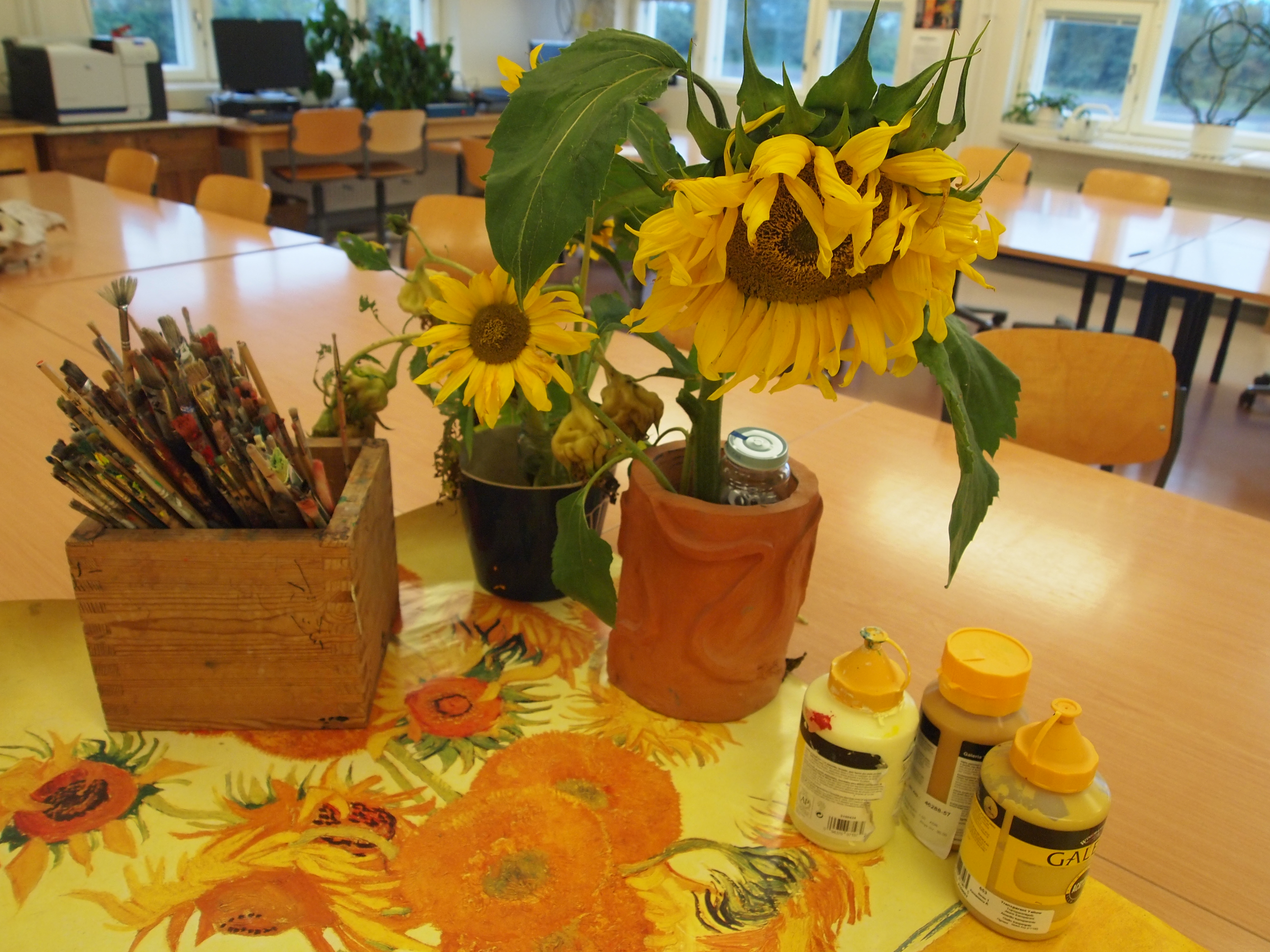 Kuuluisimpia kukkamaalauksia lienee Vincent van Goghin kahdentoista maalauksen sarja auringonkukista. Kurssilaiset maalasivat keltaisen ja okran sävyjä tutkien luokkaan tuotuja auringokukkia. Maalaus luonnosteltiin nopeasti maalaushuovalle hiilellä ja maalattiin akryylivärein. Maalatessa saattoi kokeilla impasto-tekniikkaa ja ekspressionistisille maalauksille tyypillisiä paksujakin värikerroksia. Akryyliväri kuivuu nopeasti.