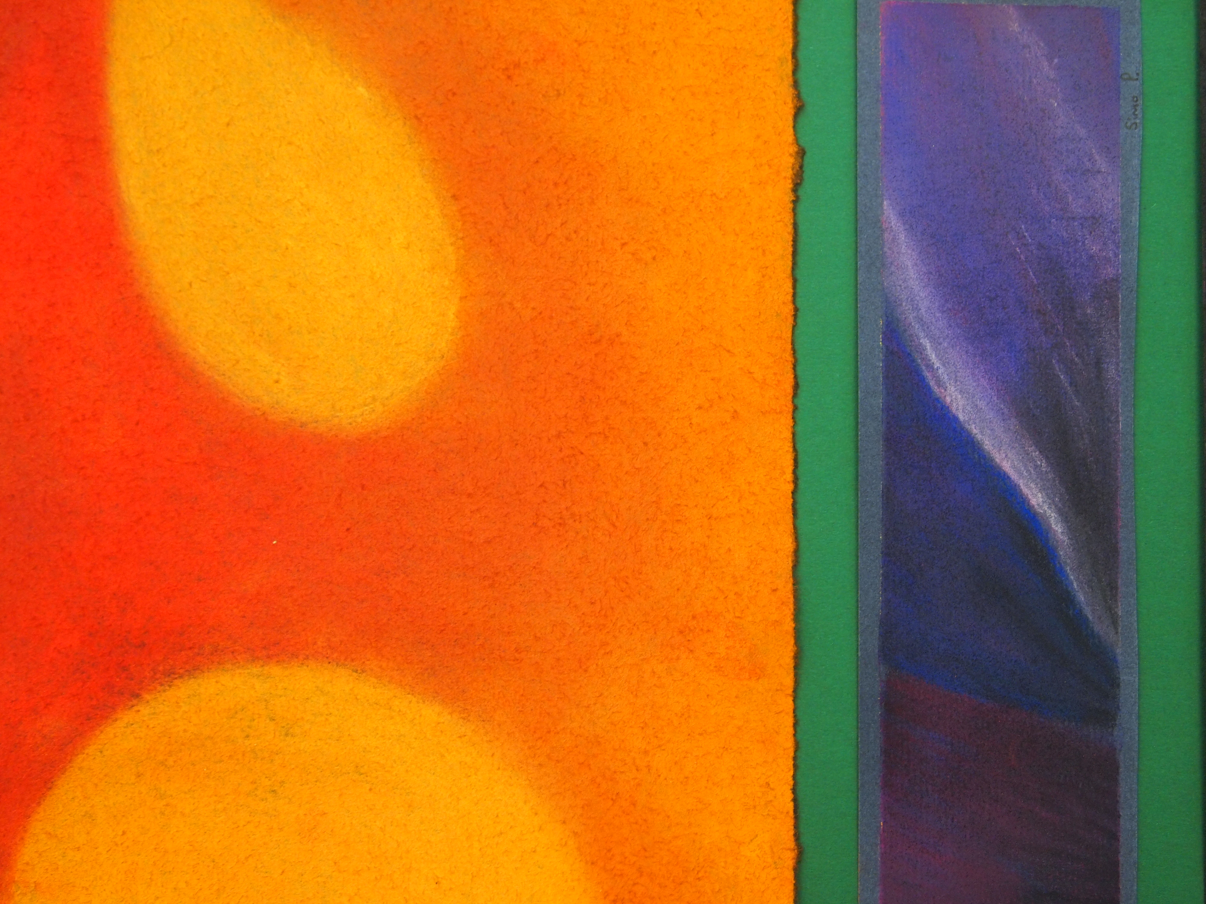 Simo tutkii orvokin ja kurpitsan kukkien muotoja ja sävyjä kuivapastelliharjoituksessaan: Kuivapastelleilla oli hauska piirtää kukkia O’keeffen tapaan. Kuivapastelleilla väreistä sai ”hohtavia” ja värit sai häivytettyä toisiinsa ilman selviä rajoja. Tummia kukkia oli mielenkiintoisempaa piirtää, mutta se on vain henkilökohtainen mielipide. Pidin näistä töistä paljon koska nopiaa ja värikästä 🙂 -Simo