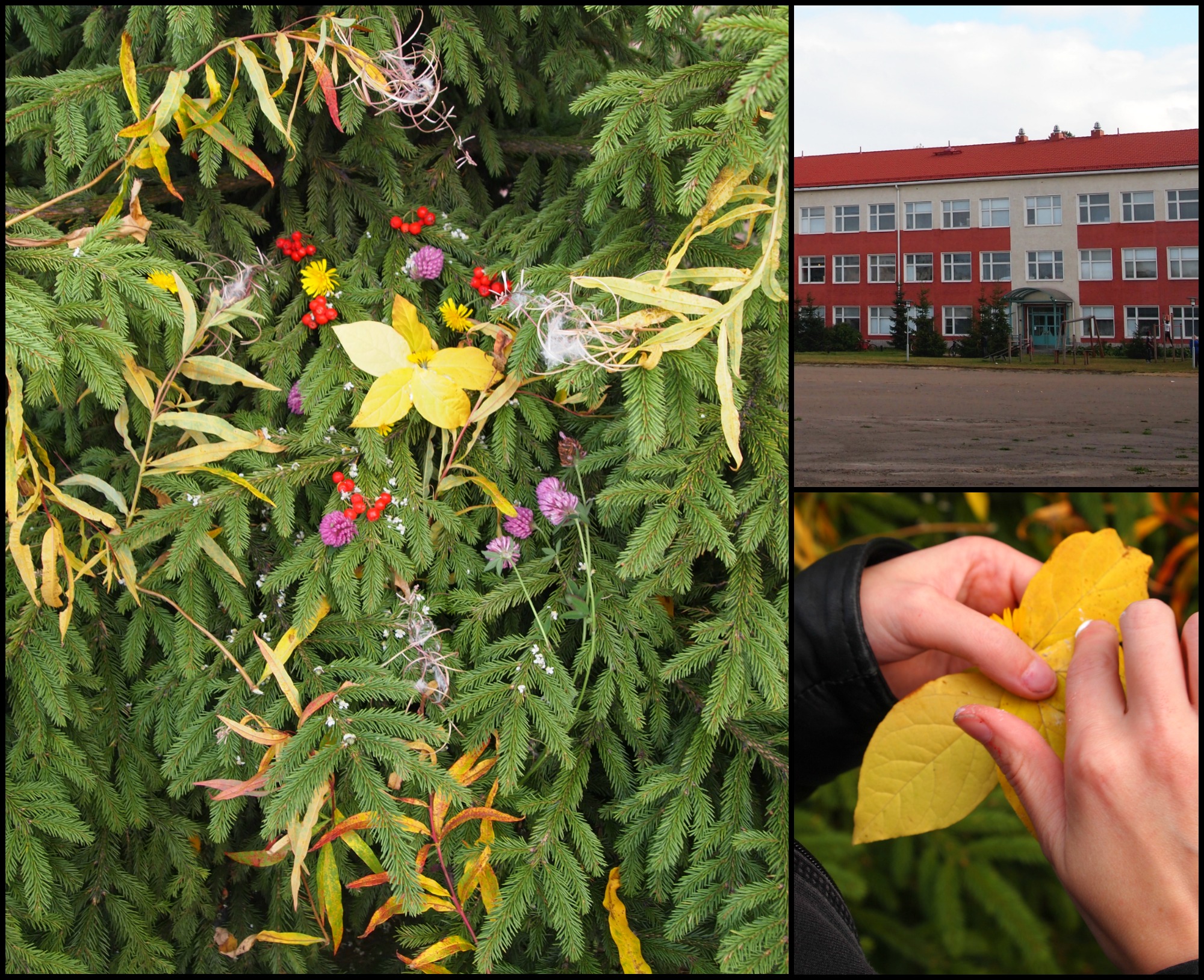 Heti ulos mentyämme otimme sen ensimmäisen idean käyttöön: Lähialue tyhjennettiin kukista ja pihlajanmarjoista, jotka tungimme lähimpään kuuseen. Viidestä keltaisesta lehdestä liimattiin kasaan joulutähti. Koiranputkesta saatiin kätevästi pientä tekolunta kuuseen. Jenna ja Jutta