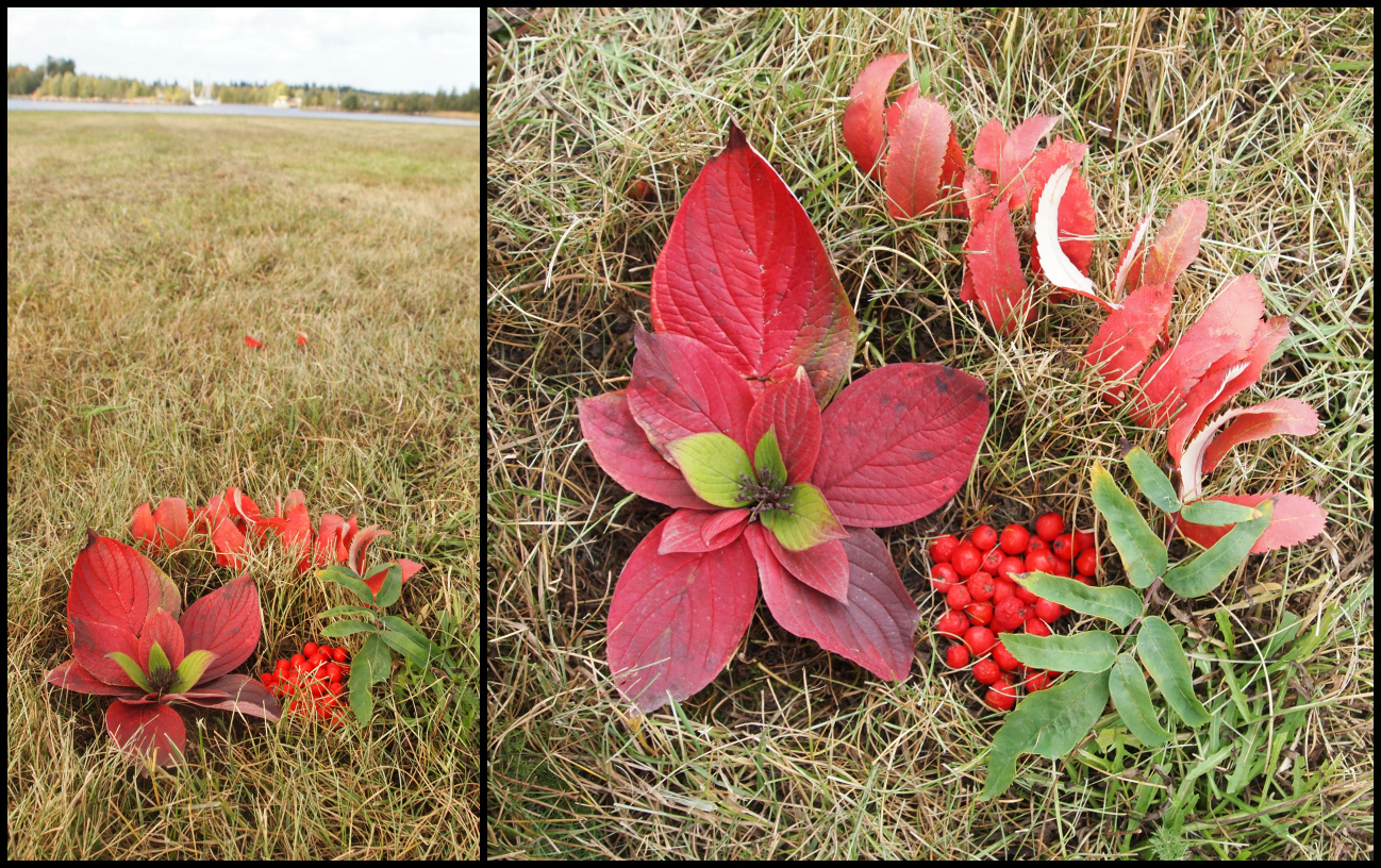 Työtä aloittaessani yritin löytää mahdollisimman valoisan alueen työlleni. Halusin välttämättä tehdä, löytämistäni punaisista lehdistä jotain etäisesti ruusua muistuttavaa. Yririn saada kukasta mahdollisimman maljamaisen, repimääni syvänteeseen, mutta pelkkä kukka näytti varsin vajaalta joten lisäsin keräämistäni pihlajanmarjoista sydämen ja pihlajan lehdistä aitauksen ja jonkin sortin katoksen niille. Meri