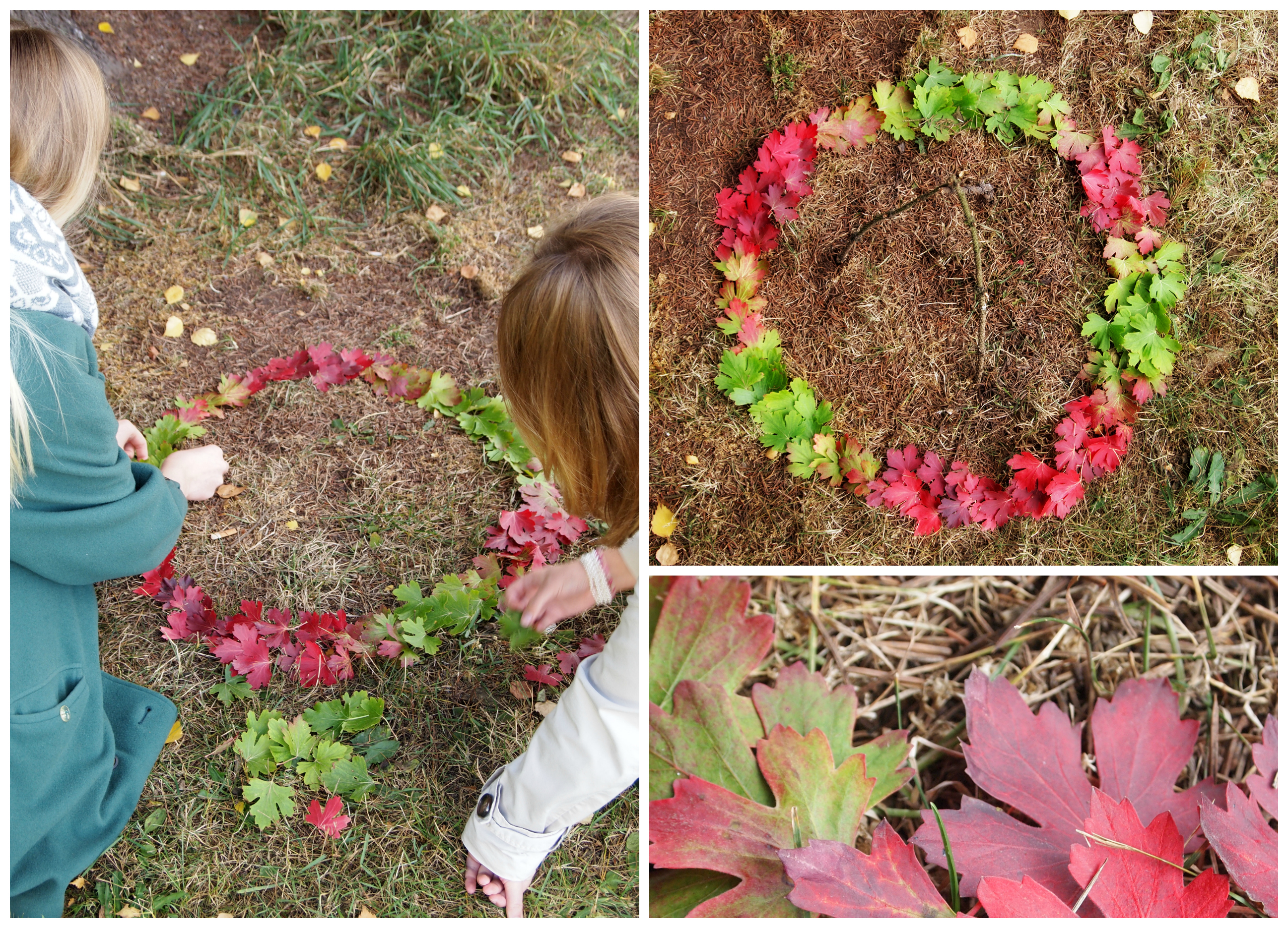 Idea työhön lähti siitä, kun löysimme tosi kivan värisiä lehtiä! Ympyrä muodostui aikalailla itsekseen, halusimme että lehtien väri muuttuu sykleittäin. Lopuksi laitoimme keskelle kolme tikkua ristiin, työstämme muodostui kuin palvonta-alttari syksyn hengille. Lehtien väreillä oli hauska työskennellä. Aliisa ja Venla