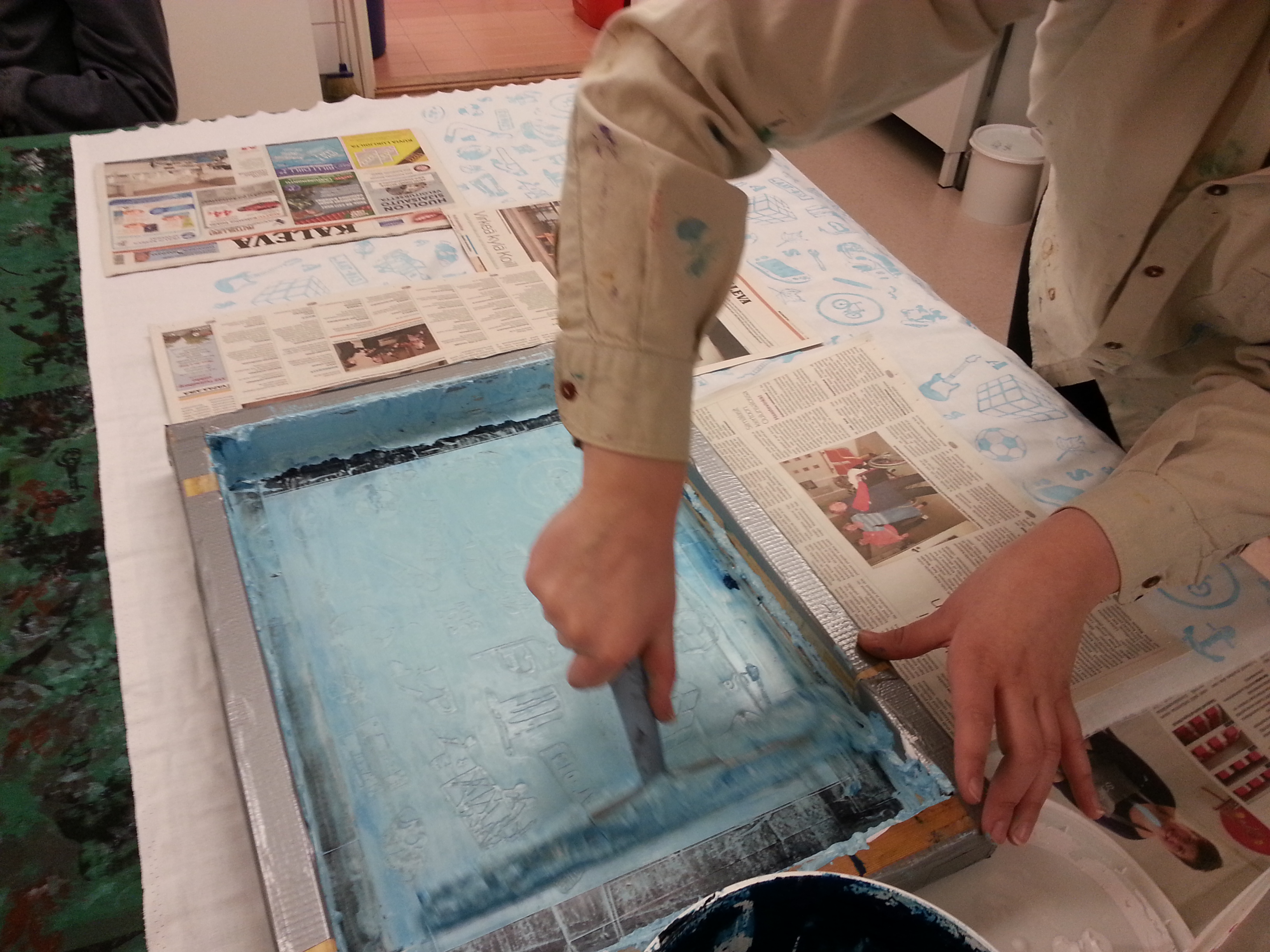 Toiseen kertaan Kuvia kankaisiin -kurssin valinneet eivät tehneet tekniikkakokeiluja, sillä KU12-kurssilaisilla oli mahdollisuus kokeilla valotuskaaviolla painamista.