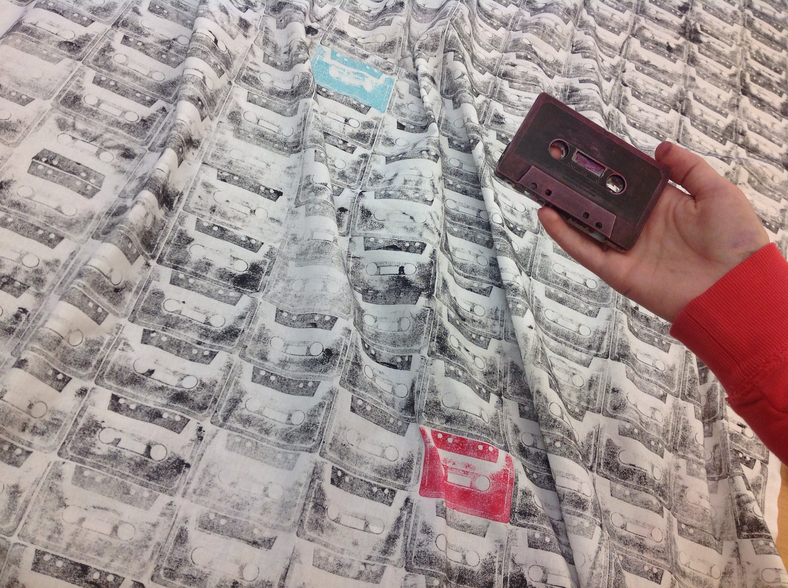Kasettikangas. En keksinyt lopputyöhön kuviota, josta olisin saanut piirrettyä hyvän ja halusin kankaasta sellaisen, jota voi myöhemmin käyttää. Keksin kotona, että painan kankaan kasetilla. Kokeilin ensin toiselle kankaalle, teenkö kuviot yhteen vai jätänkö väliä. Päädyin tekemään yhteen. Painoin melkein kaiken mustalla, mutta tein muutaman värikkään kasetin tehosteeksi. Tein pienen palan myös violetille pohjalle, mutta siihen tein kasetit erilleen. Ajatuksenani on tehdä kankaasta tyynynpäällisiä esim. sohvalle. Itse olen tyytyväinen lopputyöhön, joka onnistui hyvin. Pinja