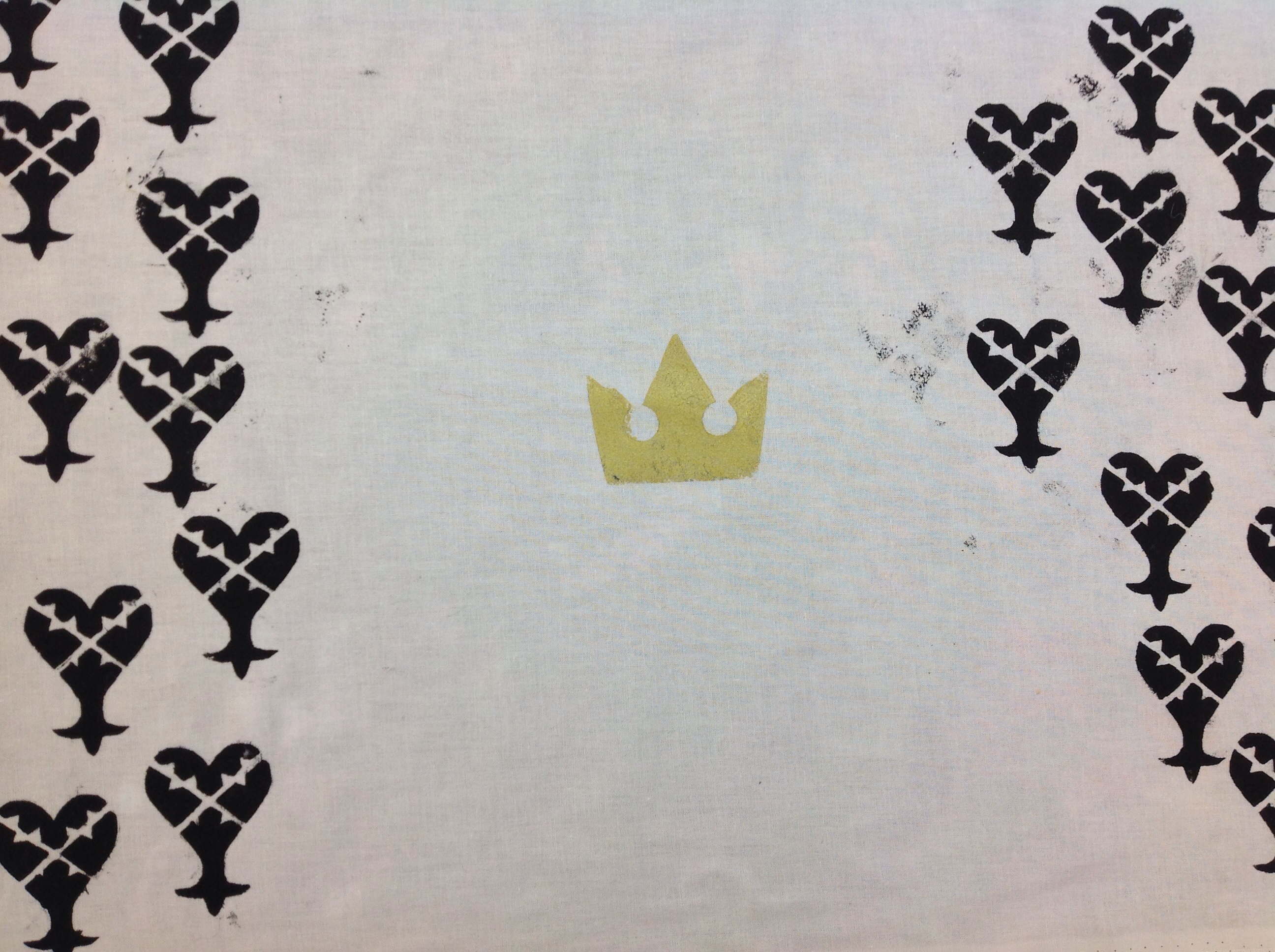 Kingdom Hearts. Työ kuvastaa pelisarjan logoja. Mustat heartless logot kuvastaa pahuutta ja yksi kultainen hyvyyttä. Työ on tehty sabloonatekniikalla käyttäen kultaista ja mustaa painoväriä. Tämä työ menee omaan käyttöön, jos alkaisi keräämään tämän kyseisen pelisarjan krääsää, niin tästä tulisi hyvä pöytäliina niille. Jäi harmittaan, kun en aluksi huomannut maalin tarttuneen teollisuusmuovin pohjaan, josta väriä kohtiin, joihin en sitä halunnut. Joni