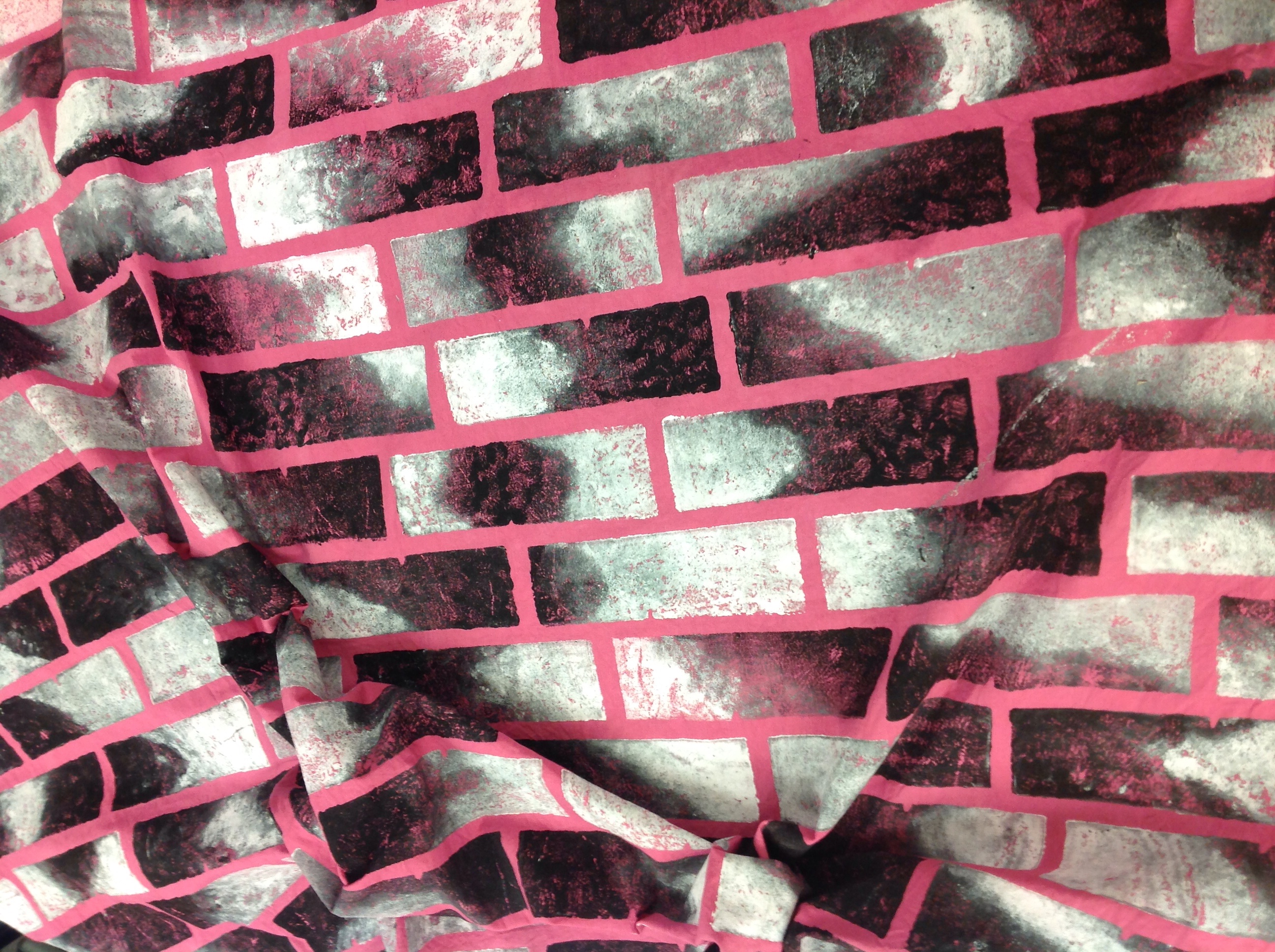 Painajainen ennen joulua – aiheinen printti. Onnistui mielestäni ihan kohtuuhyvin, vaikka olisin vielä vähän parantanut, jos olisi ollut mahdollista. Kangas on värjätty mustalla väriaineella (vaikka lopputulos onki melko vaalea) ja kuviot on painettu kankaaseen sabloonatekniikalla. Aikaa työhön kului kokonaisuudessaa n. 4-6 tuntia ja toteutus ei ollut mitenkään vaikea. Mari