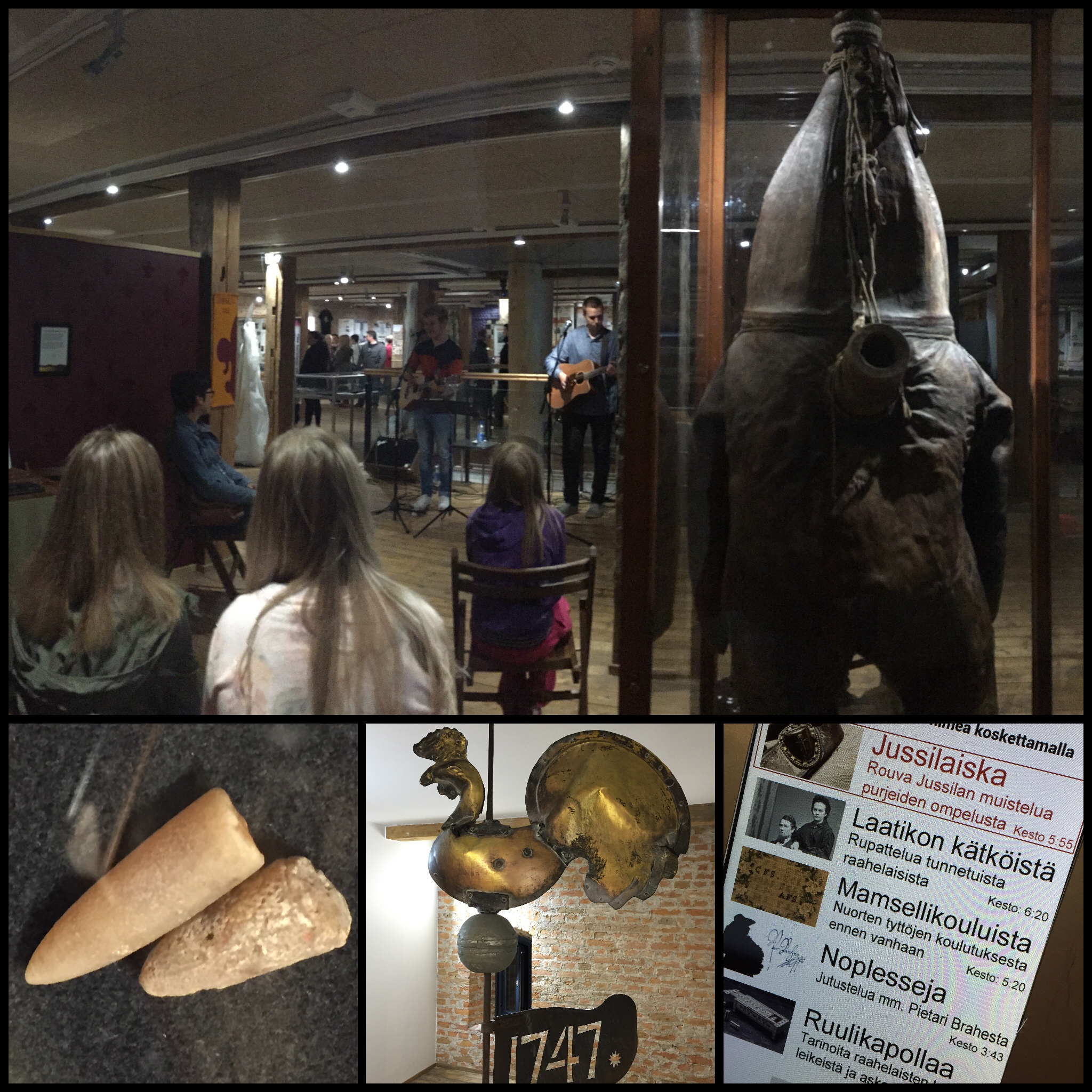 Näyttelyavajaisten jälkeen lukiolaisilla oli mahdollisuus jatkaa omatoimisesti Raahen taiteiden yön tapahtumiin. Museot olivat auki puolille öin ja ne täyttyivät musiikista, kirpputoreista ja näyttelyistä. Kruununmakasiinilla saattoi nähdä kuinka maailman vanhin sukelluspuku jammaili kitaramusiikin tahdissa.