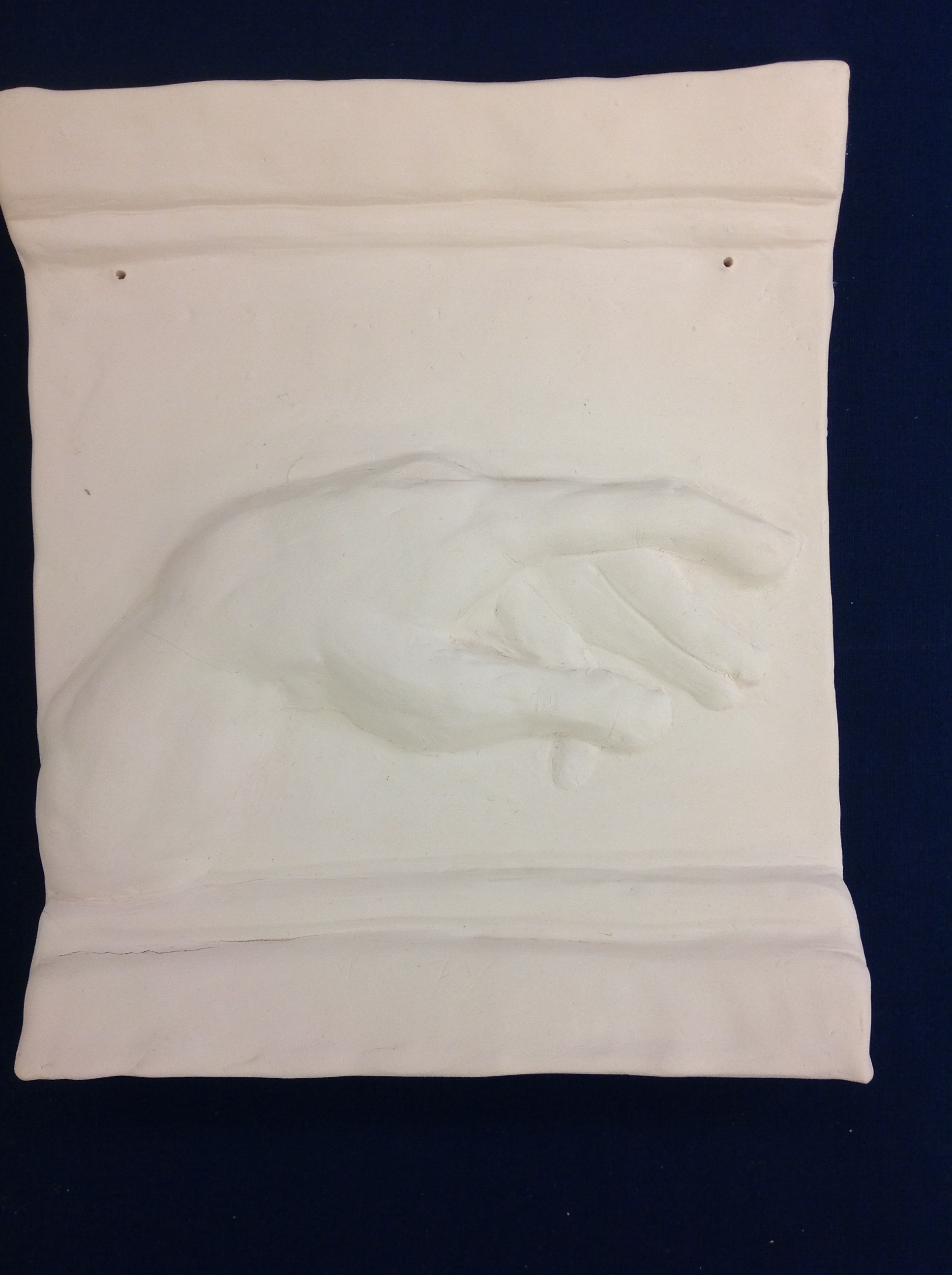 Rosan reliefi. Valkosaveen on kuvattu käsi.