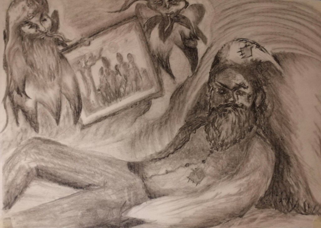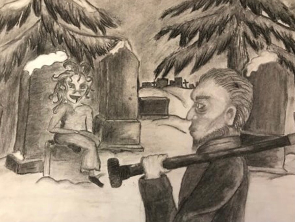 Lassi Luntenius –työ osoittautui minulle haastavammaksi. Minulla ei aluksi ollut hajuakaan, mitä aikoisin piirtää. Tiesin kuitenkin, että haluaisin Oulun tuomiokirkon taustalle, joten aloin sommittelemaan ja miettimään enemmän tarinan juonta. Ensin mietin tarinan kohtaa, jossa Lassi on Oulun kirkkomaalla ja juo ruplan rommia. Aloin jo kuvittamaan, kun minuun iski toinen idea ja päätin jättää sen hetkisen työn sikseen. Etsin netistä mallikuvia ja päädyin loppuen lopuksi kuvittamaan seuraavan tilanteen: ”Jouluaattona, vähän ennen pimeän tuloa, ilkeä Lassi Luntenius lähtee lapio olallaan Kajaanintulliin vanhalle maantielle, joka vie Oulun kirkkomaalle. Lunteniusta ärsyttää ilosta kiljuva pikkupoika, joka juoksee laulellen joululeikkeihin Linnankadulle.”