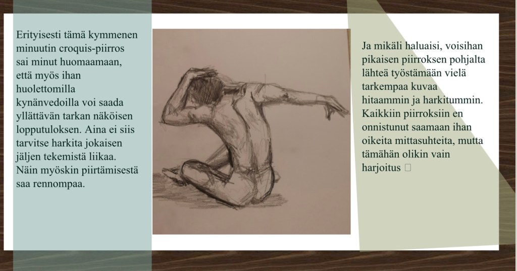 Tutki ihmisen piirtämistä ja mittasuhteita piirtämällä croquis-piirroksia katsomalla esim. valitsemassi elokuvaa tai tv-ohjelmaa ja pysäyttämällä kuvaruutu 3-6 minuutiksi piirtämisen ajaksi. Voit myös harjoitella ihmisen piirtämistä perheenjäseniä mallina käyttäen. Tutki mittasuhteita, valoja ja varjoja. Opettaja kertoo croquis-piirtämisestä eli nopeasti ihmisen minuuttipiirtämisestä oppitunnilla.
