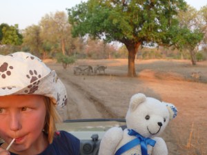 Varhain keskiviikkoaamuna 26.10.2011 Arttu otti mukavan asennon Sinikan matkalaukussa ja matka Sambian hienoon luonnonpuistoon South Luangwaan alkoi. Nousimme pieneen lentokoneeseen ja katselimme maisemia tunnin verran. Päästyämme perille Mfuween totesimme että siellä on ”hieman” kuumempi ilma kuin Lusakassa! Päivälämpötila jopa 40 astetta! Kyllä oli Artullakin jo hiki pinnassa.