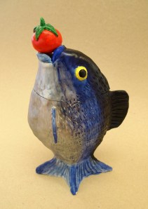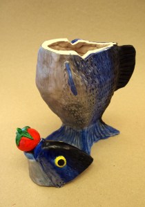 Ikkunakoriste. Saimme idean aiheeseemme kurssimonisteesta. Päätimme tehdä tuikkukupin, josta roikkuu värikkäitä koralliriutan kaloja. Ideana oli, että kynttilän valo heijastuisi tuikkukupin reiístä väloa kalojen lasitettuun pintaan. Aloitimme työt kalojen tekemisellä savesta. Aluksi tarkoituksena oli tehdä viisi kalaa, mutta kasi halkesi saven kuivuttua. Muihin kolmeen kalaa painelimme pieniä lasihelmiä pyrstöön ja eviin. Lopputuloksesta ei voinut tietää etukäteen ja yksi kala meni pilalle lasituspoltossa, kun kalaan tehty reikä meni umpeen. Tuikkukupin teimme savesta makkaratekniikalla. Saven kuivuttua muotoilimme kupin haluamaamme muotoon. Lopuksi teimme tuikkukuppiin reikiä, joista kynttilän valo tulisi ulos. Lasitimme kalat punaisella lasitteella ja tukkukupin sinisellä. Tuikkukupin lasitus onnistui, mutta vielä tuli mutkia matkaan, kalat jäivät lasituksessa toisiinsa kiinni. Irrotettuamme kalat toisistaan, niistä irtosi hieman lasitetta, mutta emme antaneet sen häiritä. Lopuksi kiinnitimme kalat naruilla tuikkukuppiin. Kalojen naruihin lisäsimme helmet koristeeksi. Teimme myös pienen ripustuslenkin helmien koristelemana, josta tuikkukupin saa roikkumaan.