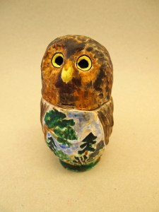 ”Tavoitteenani oli saada tehtyä ´toimivan´ näköinen astia. Tähän asti en ole osannut työstää savesta sellaista muotoa, mihin olisin tyytyväinen, mutta nyt se onnistui. Kannesta tuli aidon- ja hyvännäköinen, ja itse ruukusta ihan kaunis. Savityötä maalatessani yritin olla erityisesti karhusta tarkka. Hiukan harmittaa, ettei ruukkua voinutkaan lasittaa, mutta ehkei sillä niiiiiin kamalasti lopulta ole väliä, jos sitten KU9-kurssilla tekisin uuden, jonka lasitan.”