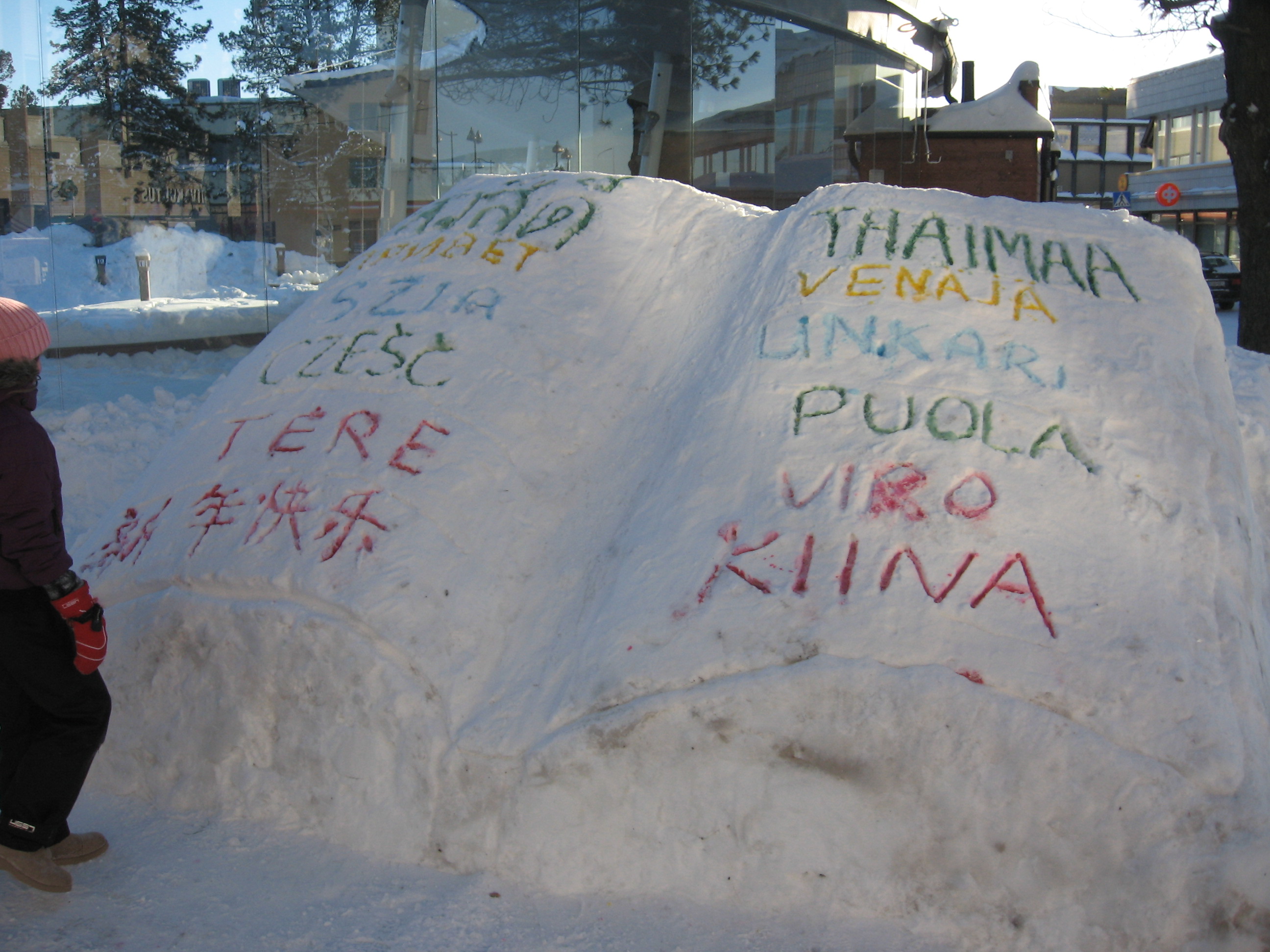 Härkätorin puistossa järjestettiin kolmannen kerran lumiveistoskilpailu. Tänä talvena lunta on riittänyt taiteen raaka-aineeksi. Lukion koeviikon, penkkarisuunnitteluiden ja wanhojen päivän vuoksi ei koulun omaa joukkuetta kilpailuun osallistunut. Lukion edustajana olin kolmatta kertaa tuomaristossa nauttimassa monenlaisista veistoksista. Lapsiperheet olivat löytäneet liukumäet ja tunnelit. Simänruokaa tarjosivat sadunomainen sammakko jääkruunuineen ja jättimäinen lisko. Hyytävässä viimassa, mutta aurinkoisessa säässä oli kansainvälistä tunnelmaa: suuren lumikirjan lehdelle oli kirjoitettu tervehdys yhden joukkueen jäsenten äidinkielillä.