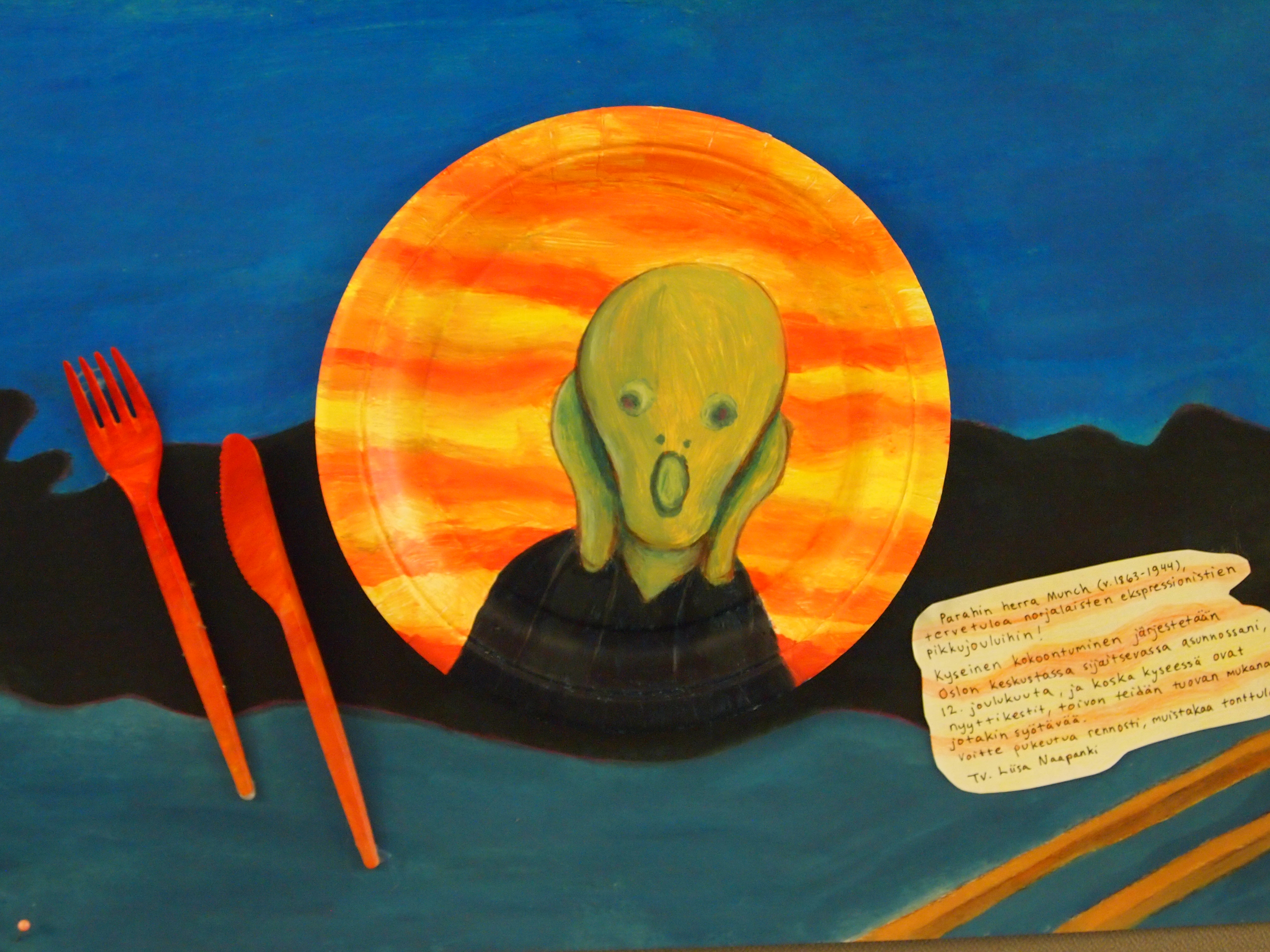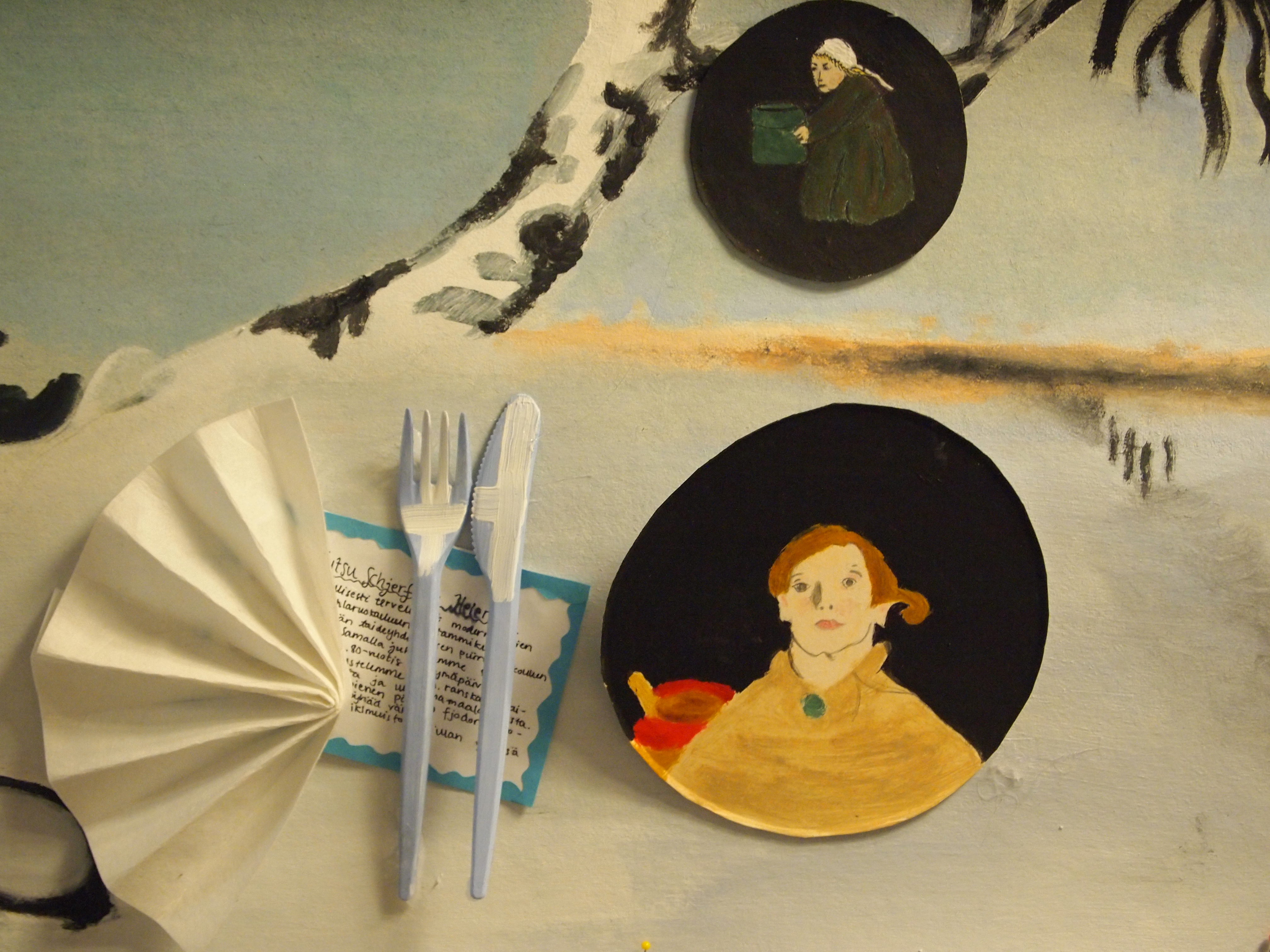 KU1-kuvistunnilla tehtiin kotitehtävän pohjalta TAITEILIJA RUOKAPÖYDÄSSÄ -taideteos. Käytimme työskentelyssä akryylivärejä ja kollaasitekniikkaa: