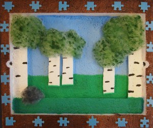 Koivikko Taulussa on koivuja. Kaksi koivua lähempänä ja kolme kauempana. Toisen lähempänä olevan koivun edessä on kivi. Kehykset ovat ruskeat ja niissä on sinisiä palapelinpalasia. Koivujen lehdet ja kivi on tehty pumpulista. Palapelin palat ovat kovia ja kaikki muu pehmeää. Taulun koivuista tulee mieleen suomalainen maisema. Pumpulissa oleva maali tuo hyvin mieleen lehdet ja puissa olevat mustat raidat auttavat tajuamaan, että ne ovat koivuja. Itse olen tyytyväinen työhön ja se näyttää miltä pitääkin. Milka