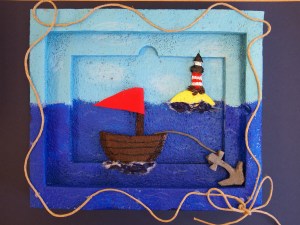 Toivo yli laidan Parhaiten työssäni onnistui majakka ja sen saari. Sain niistä tehtyä sopivan kokoisia veneeseen nähden, mutta muuten en saanut tehtyä syvyysvaikutelmaa. Vaikka vene on paljon suurempi kuin majakka, sei ei näytä olevan lähempänä. Olisi pitänyt laittaa saarta ja venettä ehkä vähän päällekkäin, niin syvyysvaikutelmaa olisi ollut enemmän. Ja meren olisi voinut asteittain vaalentaa taivaaksi. Mutta ainakin työstä tulee ihan merellinen tunnelma… Vilma