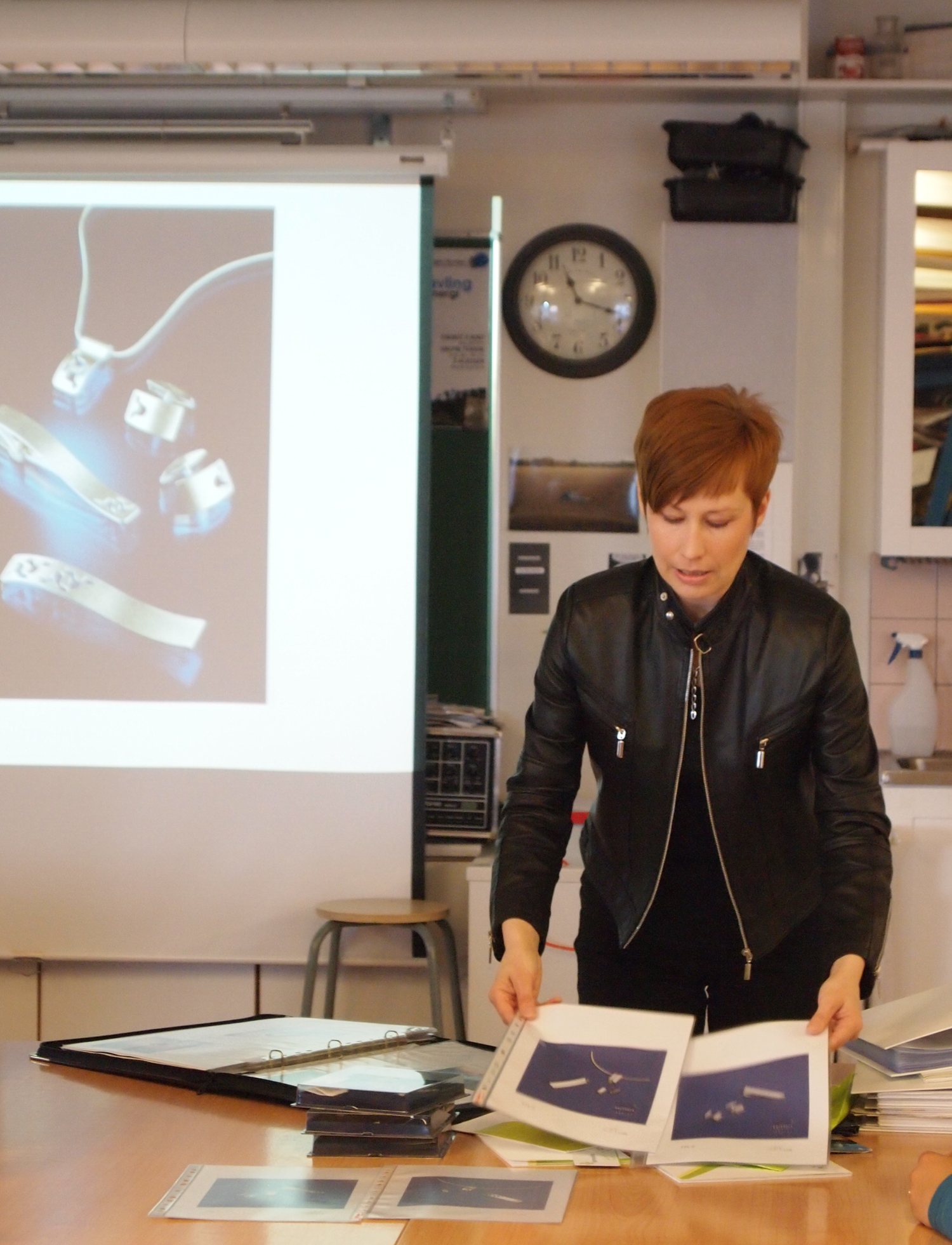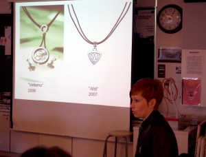 Opiskelijat kuuntelivat kiinnostuneina korujen suunnittelun käänteitä ja kertomuksia suunnittelun taustalla.