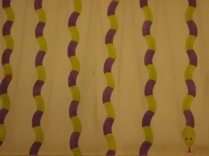 Työssäni on hyvin pitkä käärme, jossa on kahta väriä. Halusin tehdä jonkin värikkään ja iloisen työn, joten päädyin tällaiseen lopputulokseen. Tein neljä sapluunaa ja tuputin väriä kankaalle. Olin joskus ala-asteella tuputtanut viimeksi, mutta kokeilun avulla pääsin tuputuksen salojen jäljille.Minusta onnistuin hyvin luomaan hyväntuulisen työn. Pienet sotkemiset olisi voinut jättää pois. Atte
