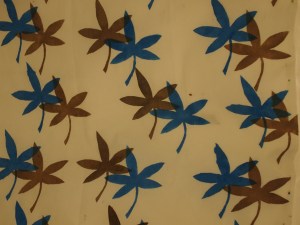 Turquoise – turkoosi Halusin tehdä kesäisen ja raikkaan värisen kankaan. Aluksi ajattelin tehdä jonkinlaisen kukan tai hedelmän kuvioksi, mutta päädyin abstraktiin kuvioon. Inspiraatiota hain netistä googlettamalla intialaistyylisiä kankaita. Tein työn käyttämällä sabluunatekniikkaa. Värin valitsin siksi, että turkoosi on tämänhetkinen lempivärini ja se sopi mielestäni hyvin kuvioon. Työ oli hiukan haastava, koska vaati tarkuutta ja keskittymistä saada kuviot kohdilleen. Se valmistui kuitenkin suhteellisen nopeasti. Kuviot olisivat voineet mennä paremminkin kohdalleen, mutta muuten kaikki onnistui. En ole vielä varma, mitä kankaasta teen, mutta varmaan annan sen lahjaksi kumipojalleni jossain muodossa. Jenni