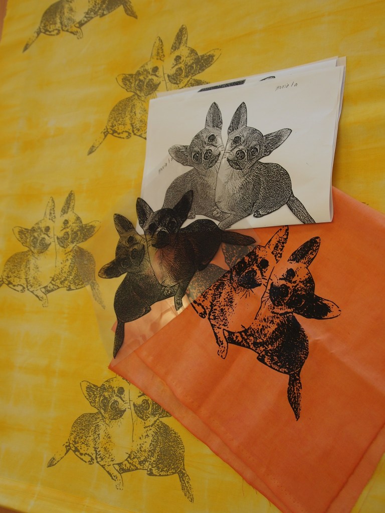 Kuvansiirtoa valokopioista ja printeistä Kiva-lakalla kankaalle. Lakkaa kankaaseen ja kuvan toiselle puolelle – paperi hangataan veden kanssa irti kuvan jäädessä kankaaseen kiinni.