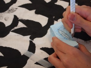 Palikkapainantaa valmistellaan. Kirurginveitsellä leikkaamien on tarkkaa työtä. Koholle jäävät kohdat tulevat kankaassa värillisinä esiin.